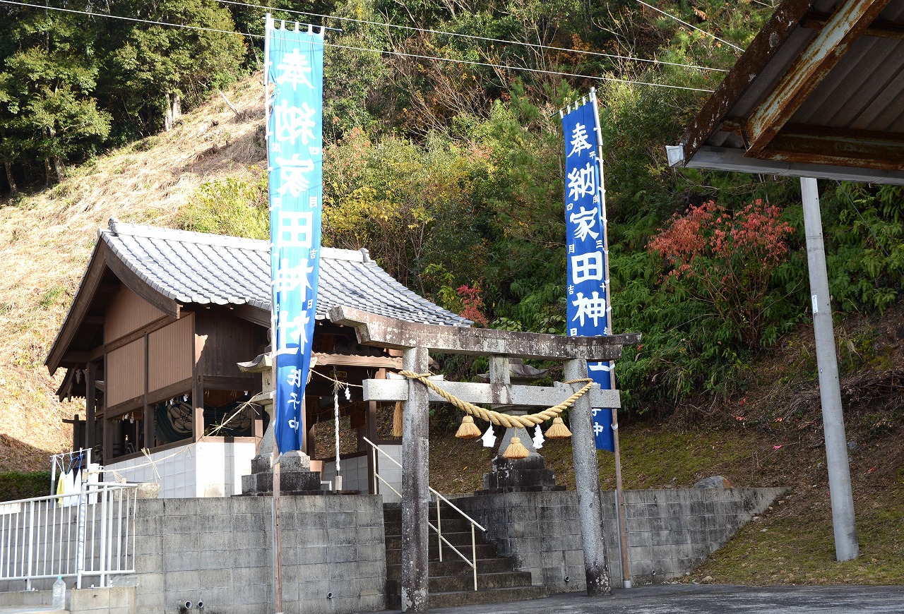 家田神社=北川町長井311-4=御祭神は「大山積神」(おおやまつみのかみ)」=大いなる山の神=と「大年神(おおとしのかみ)」=農耕や穀物にまつわる神=。「和田津見神」(わだつみのかみ)=海の神様=、「菅原神」(すがわらのかみ)」。本殿は、流造りで2坪、拝殿は、切妻造りで9・8坪。由緒は不詳ですが、所蔵の棟札によると、享保15年戌(いぬ)年(1730)11月に本殿が再興され、さらに、寛政2戌年(1790)2月にも本殿が再興されています。明治4年11月に長井神社に合祀されましたが、同13年3月1日、再復鎮座を出願し同14年12月17日に許可され、15年1月2日に復社しました。例祭日は、12月6日です。