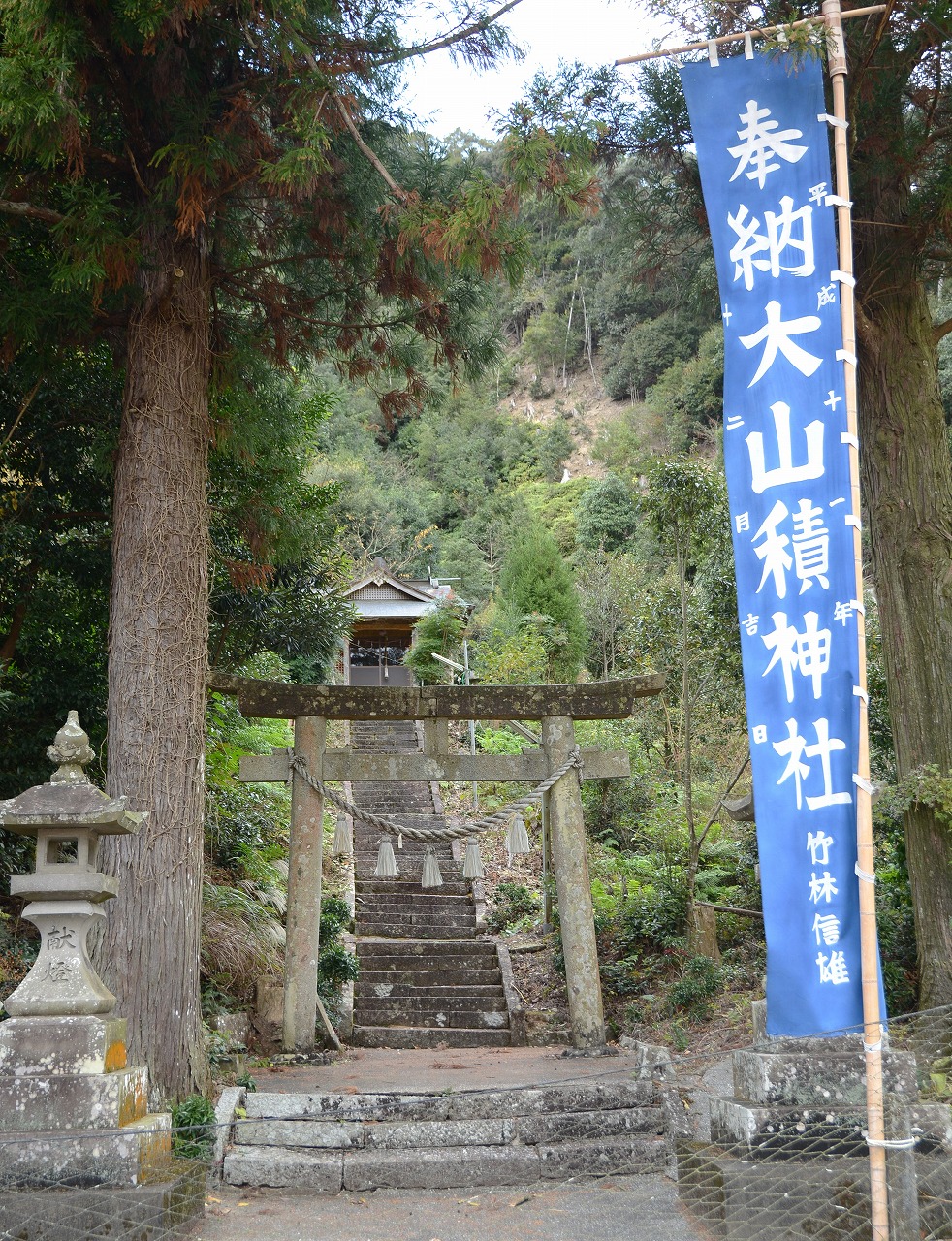 大山積神社=北川町長井字日ノ谷4872-ト-乙=創建や由緒などは不詳ですが、棟札(むねふだ)によると、文化元甲子(きのえね)年(1804)11月12日に延岡城主、内藤帯刀神主・井本石見太夫実輔=刀を持つことが許された神主=により社殿が再建され、さらに文化4卯(うさぎ)年(1807)2月に城主・内藤亀之進により拝殿と神楽殿が再建されています。=宮崎県史蹟調査より=。明治4年(1871)には長井神社に合祀されましたが、同15年に再復鎮座しました。その後、平成3年(1991)11月に社殿の改修が行われています。本殿は、千鳥破風(ちどりはふ)造り1・7坪、拝殿は入母屋(いりもや)造り8・6坪。千鳥破風とは、三角状にせり上がった屋根の装飾の一種。入母屋とは、日本建築の代表的な屋根の形で、上部が切妻造り、下部が寄棟造り。ご祭神は、山を司る神「大山祇命」(おおやまつみのみこと)。古事記では「大山津見神」、日本書紀では「大山祇神」、伊予国風土記では「大山積神」が使われ、神社本庁傘下の神社1万318社のうち、85%が「大山祇命神」、9%が「大山津見神」と表記しています。「大山祇命神社」は全国に897社ほどあり、総本社は愛媛県今治市大三島。鉱山開発を目的に勧請された神社もあります。例祭日は12月5日です。