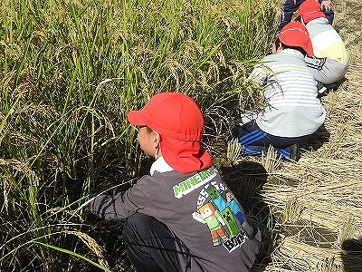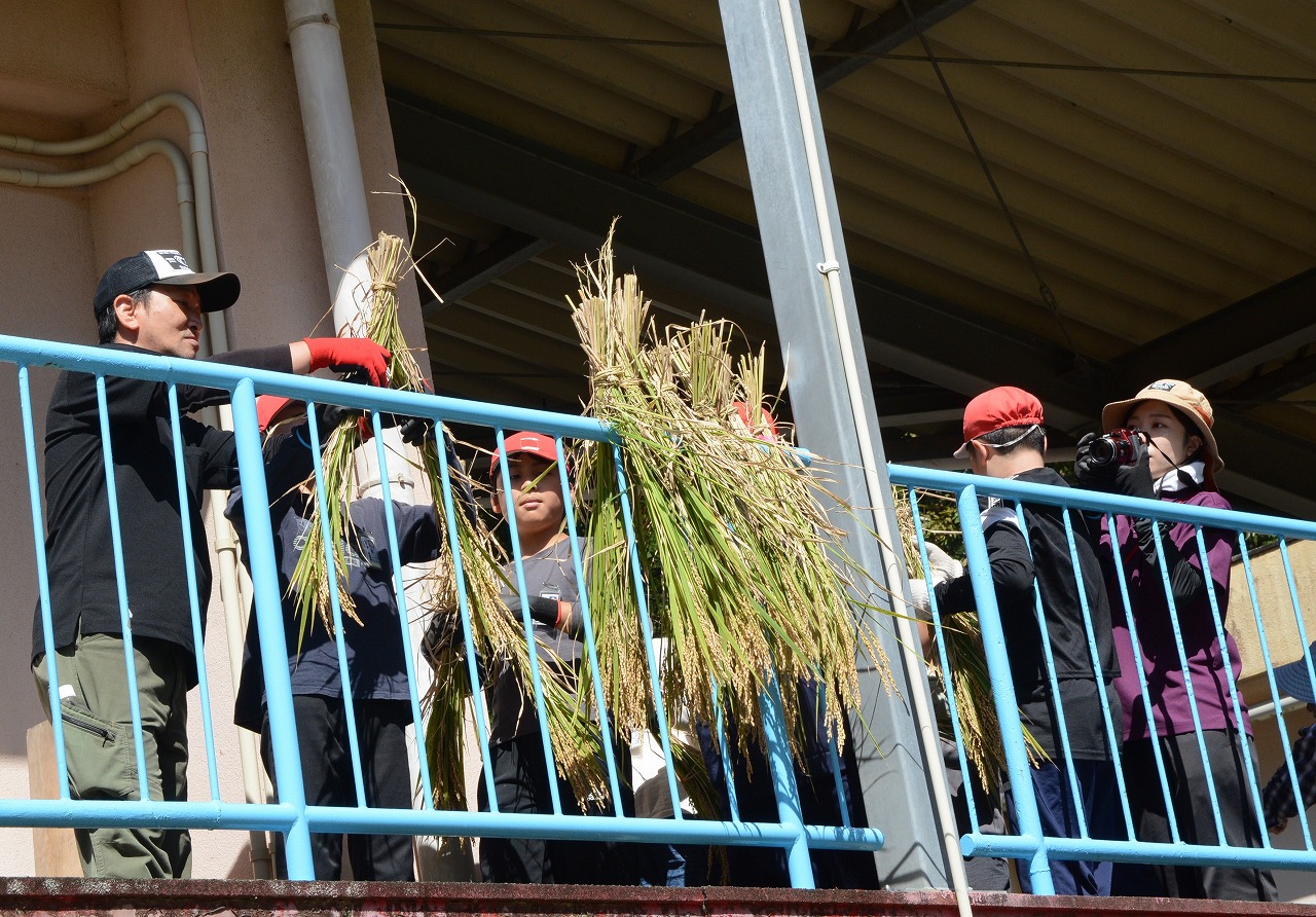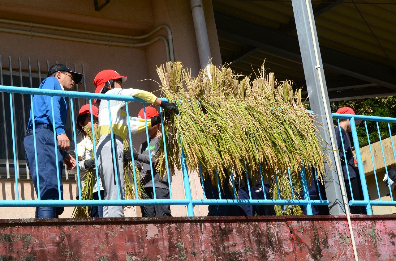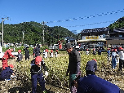 「ユネスコスクール」に9月9日付で登録された北川小学校(宇都宮浩校長、100人)の5年生15人が9月30日、町内の田んぼで稲刈り体験を行いました。同小では「希少生物が生息する家田湿原の散策やホタルかごの作り方を学ぶ」「川坂神楽の舞の練習、小中合同のクリーン作戦」など各学年で「北川の豊かな自然環境との共生」をテーマとした学習に取り組んでいます。このうち、5年生のテーマは「地域の農業や漁業を営んでいる方に話を聞き、北川町の魅力的な産業を学ぶ」。稲刈りはその一環で、JAみやざき青壮年部北川支部が協力、同町川坂の農業、黒田五司さん所有の田んぼを借りて行われ、地元の人や引率の先生らと共に約1時間をかけて手作業で稲を刈り取り、稲は学校に持ち帰り体育館の手すりに干しました。