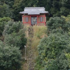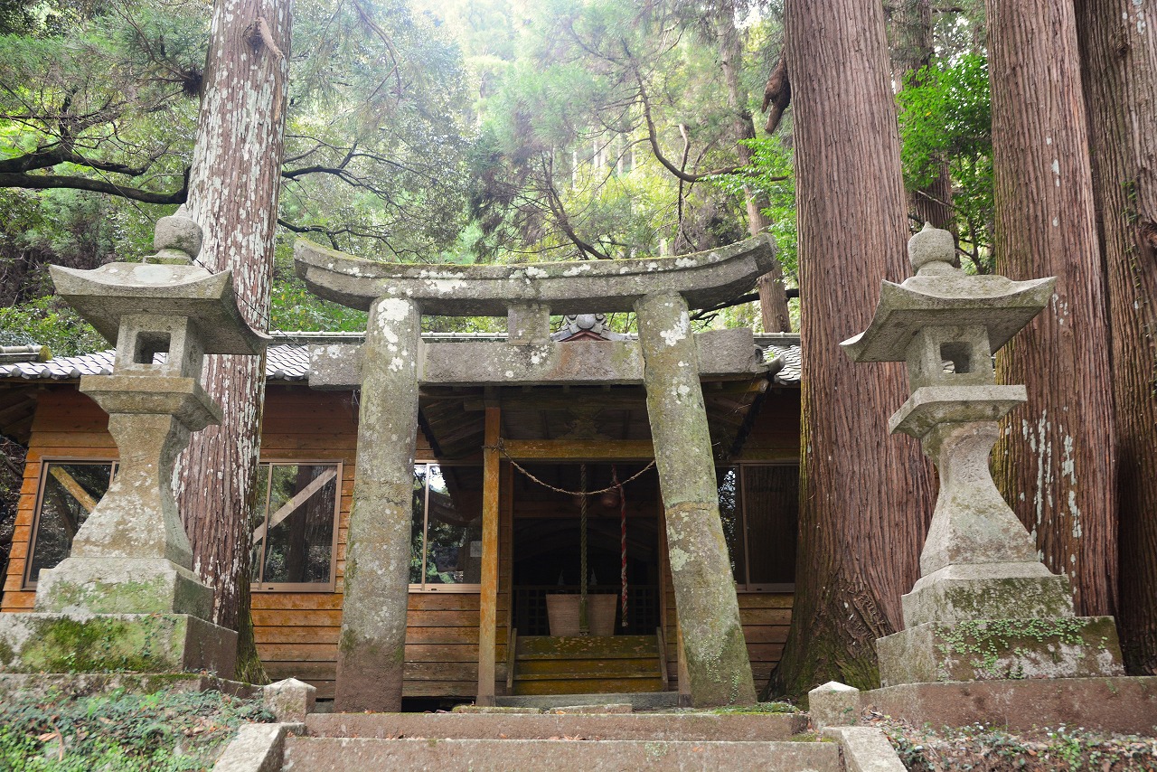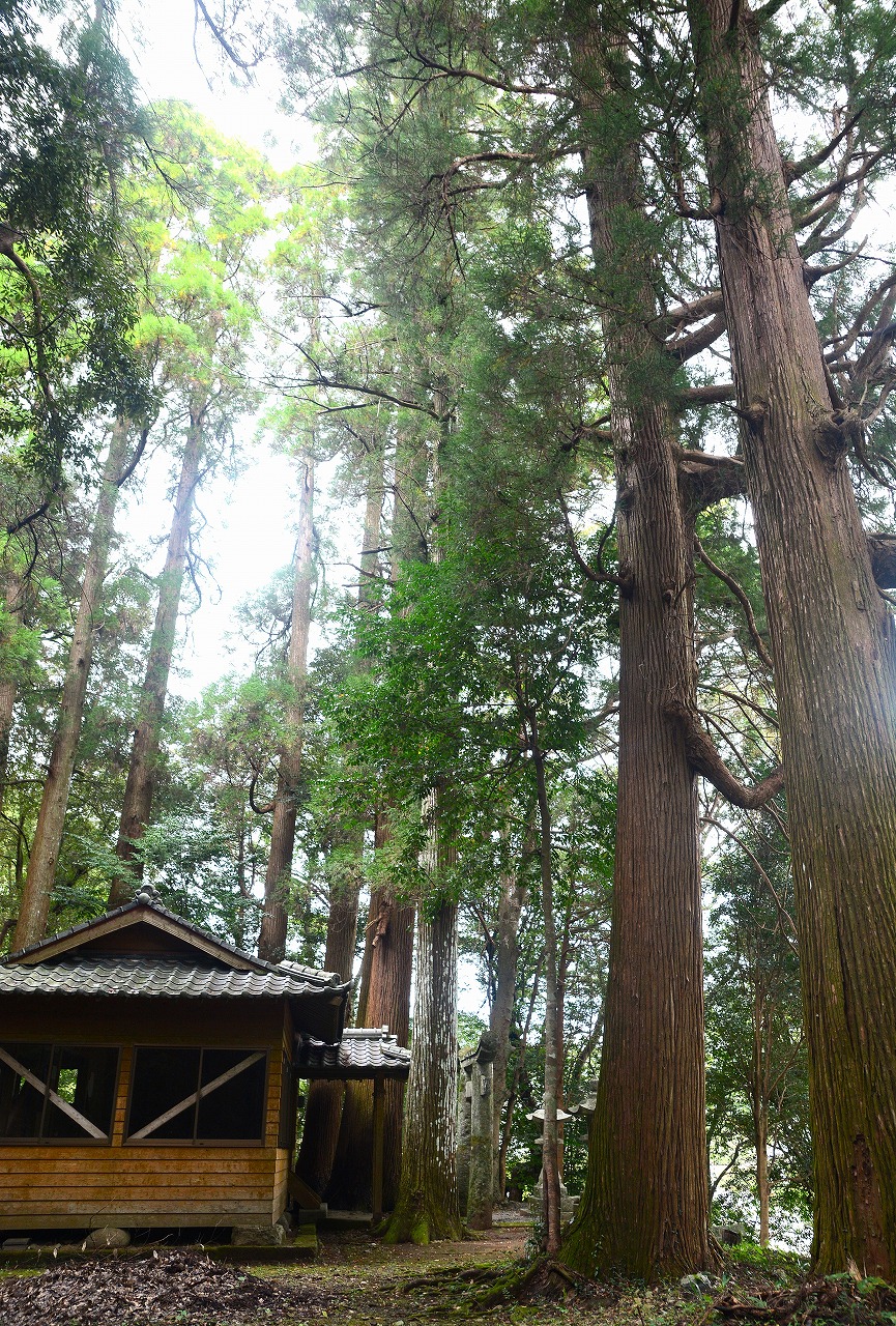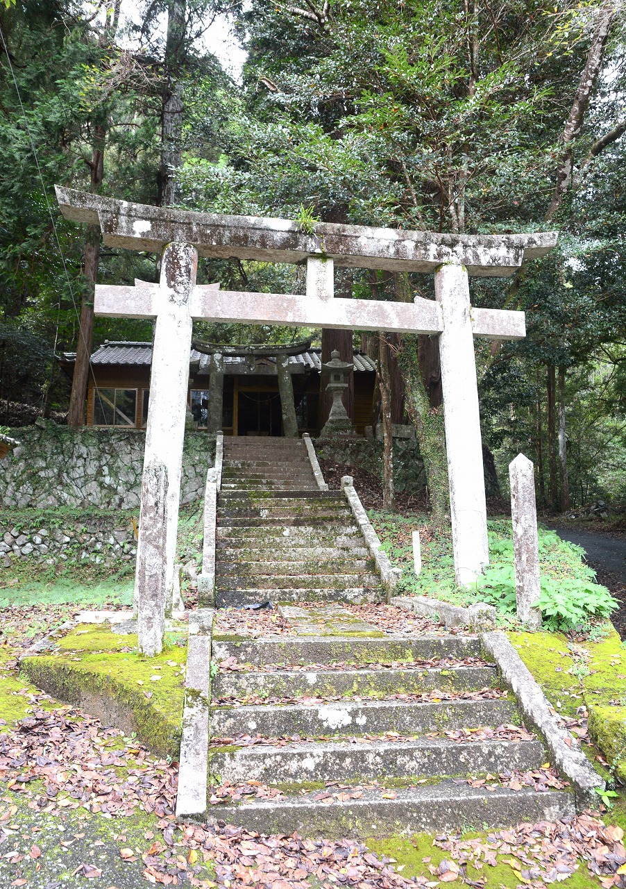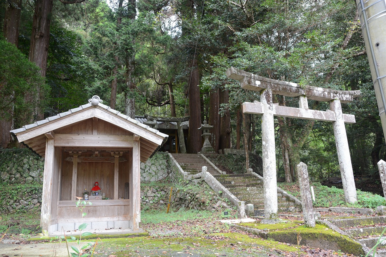 上赤神社=北川町川内名谷向9765=創建された年月日は不明。もともと天満神社と呼ばれていましたが、明治4年(1871年)11月1日に下赤天満神社と字黒内天満神社を合祀し、「上赤神社」と改称、村社に格付けされました。棟札によると、宝暦13年(1763年)11月と文政10年(1827年)11月に社殿が再興された記録が残っています。本殿(破風造)は1.5坪 拝殿は 10坪。拝殿前の鳥居には、享保6年(1721)9月9日の銘があります。例祭日は12月4日。御祭神は、学問の神様として知られる菅原道真公(すがわらみちざねこう)。境内には、「樹齢百年超」と地元の人が言う杉の大木が十数本、本殿を見下ろすように林立する様は圧巻です。