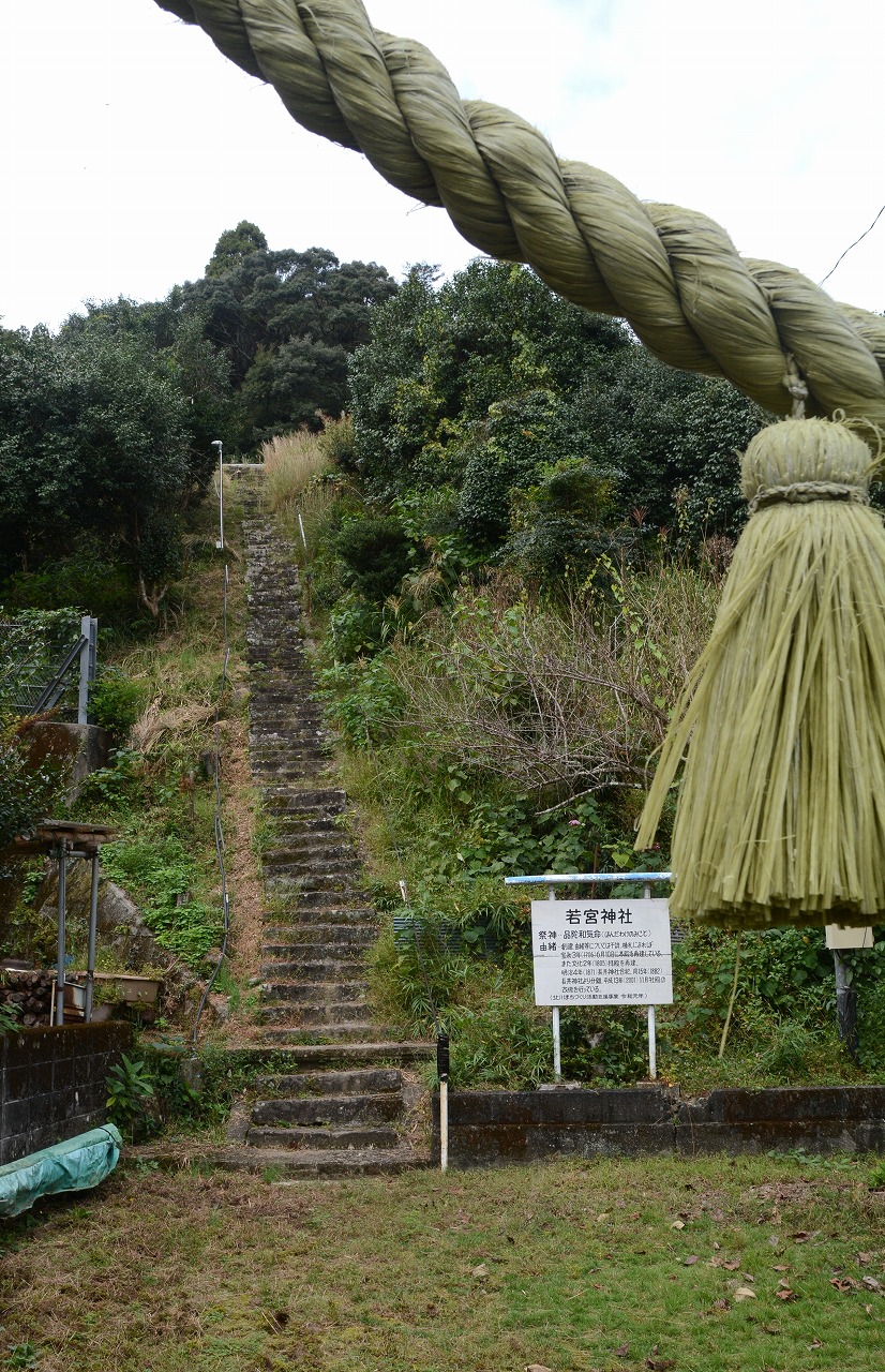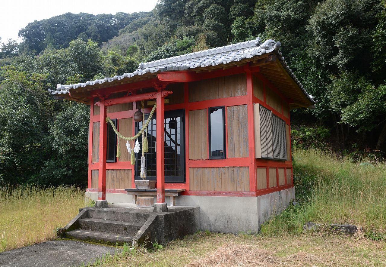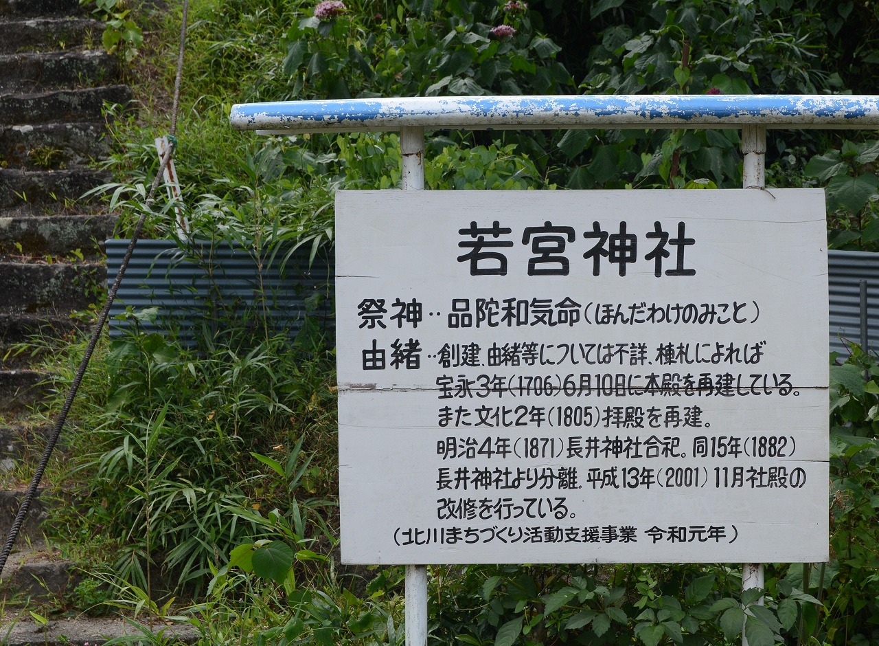 若宮神社=北川町長井字竹瀬5192-へ=由緒は不詳ですが、棟札によれば宝永3年(1706)6月10日に本殿、享保4年(1719)11月10日に本殿、安永4未年(1775)4月27日に本殿の再建が行われ、文化2年(1805)6月13日には延岡城主・内藤備後守代神主「井本岩見太夫実輔」により拝殿の再建が行われています。(『宮崎県史蹟調査』より)。その後、明治4年11月に長井神社へ合祀されましたが、同13年3月10日に復社出願をし、同14年10月14日に許可され、同15年1月1日に復社遷座しました。昭和初年に社殿の改修を行いましたが、その後拝殿の傷みが激しく、平成13年(2001)に再建工事を実施し、同年11月25日に完成しました。本殿(流造)は2坪 拝殿(入母屋造)は7.2坪。例祭日は12月15日。社殿前広場から東に眺望が開け、東九州道の高架橋や日豊線鉄橋、川坂の家並み、北川流域が見渡せます。御祭神は、品陀和気命(ほんだわけのみこと)。第15代天皇の「応神天皇」は、八幡大神として全国の八幡社に祀られています。 別名で「品陀和気命」とか、「八幡大菩薩」(はちまんだいぼさつ)と称され、欽明天皇32年(571)に初めて九州宇佐の地にご示現になられました。 皇室は、宇佐八幡宮や石清水八幡宮を伊勢神宮に次ぐ、第二の宗廟として八幡大神を崇敬しました。