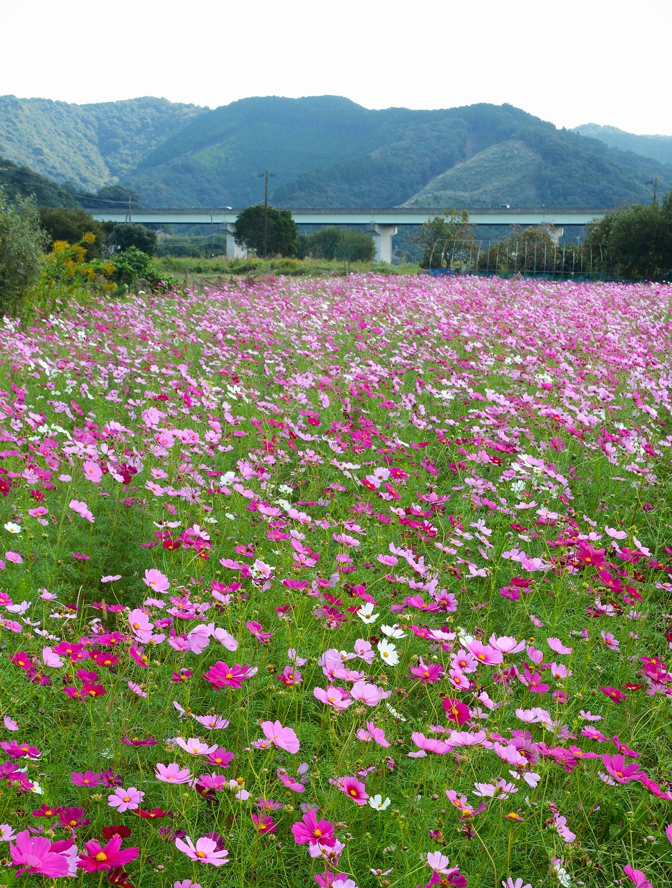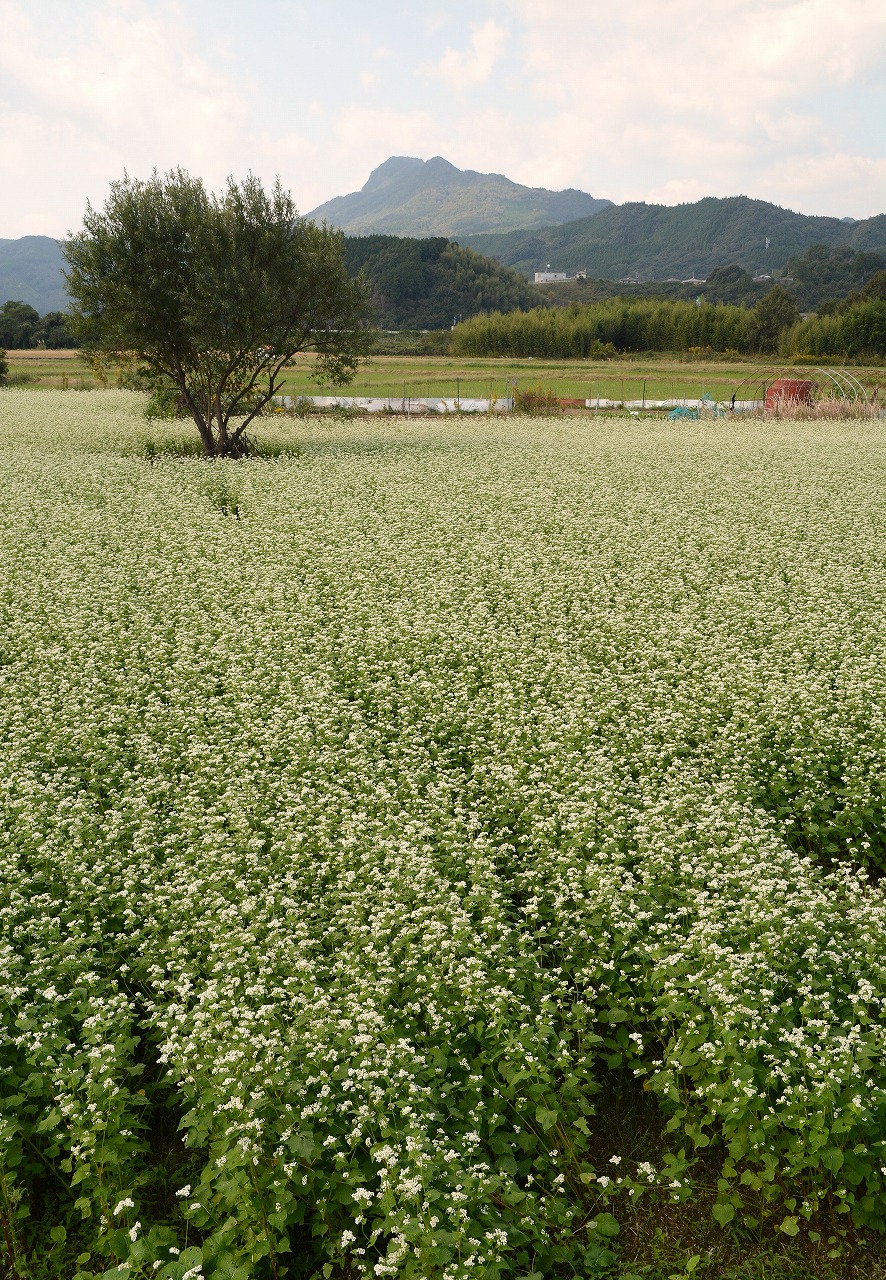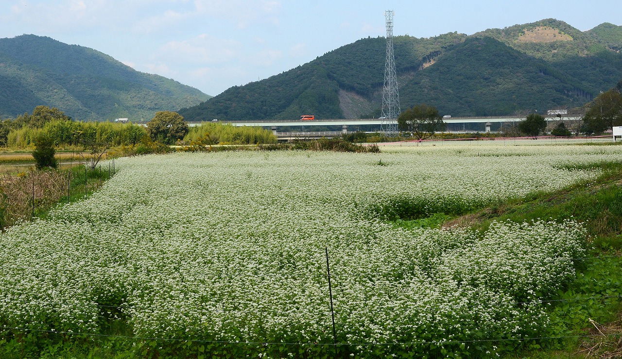 「真っ白いソバの花とコスモスが満開ですよ」と館を訪れた町内の方から情報を頂き、秋晴れの10月27日、カメラ片手に撮影に出かけてきました。東九州道が南北に横切る家田(えだ)地区生活改善センター周辺の田んぼは一面ソバの花で真っ白。近くの川坂地区の休耕田ではコスモスの花が満開期を迎え、稲刈り後の田んぼがソバの白とコスモスの鮮やかな赤や黄色に彩られていました。ソバの花は、地元の農家で作る営農組合が耕作放棄地対策として数年前から植え、収穫後市内のソバ店などに出荷しているそうです。岩佐美基代表によると、今年は順調に育っており、12月初めにも収穫し、収量は2トンを見込んでいるそうです。一方、コスモスを育てているのは家田・川坂地区環境保全会の方々。害獣対策の一環として使われなくなった田んぼや畑を再耕し、花や農作物を栽培しているとのことです。ソバの花もコスモスも来月中旬辺りまで見ごろです。