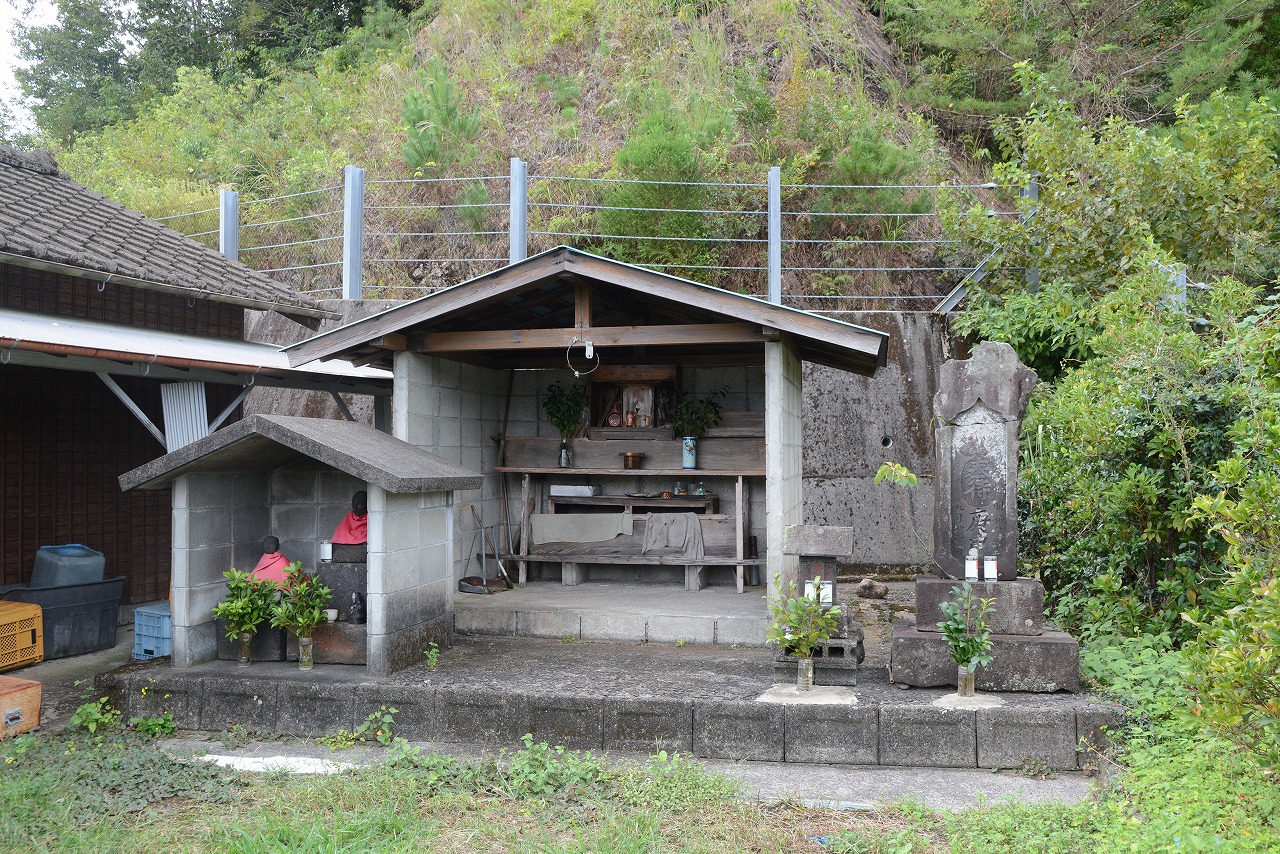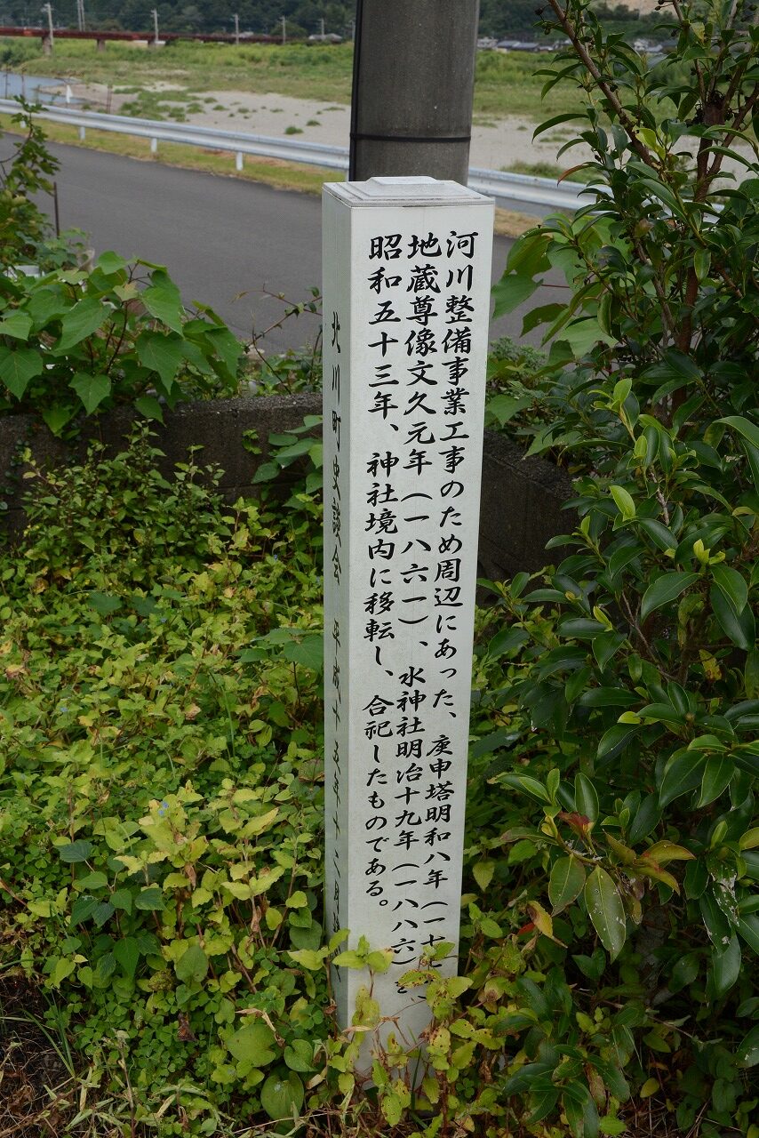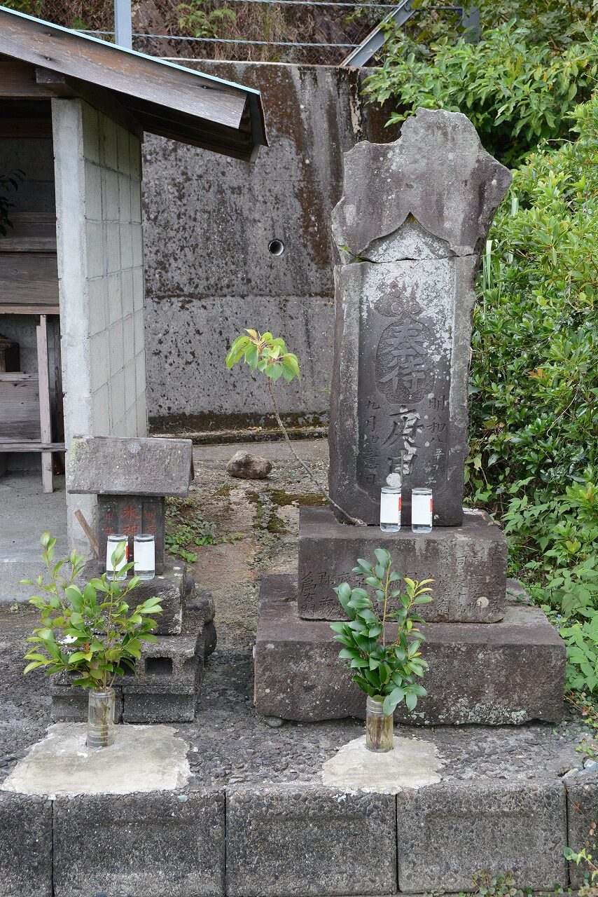 飛石大年神社=北川町長井5358-2=「宮崎県史蹟調査」によると、明治4年11月に長井神社に合祀されました。「北川町史談会」が平成15年12月神社敷地内に建立した指標柱には「河川整備事業工事のため周辺にあった庚申塔、明和八年(一七七一)、地蔵尊像、文久元年(一八六一)水神社、明和十九年(一八八七)を、昭和五十三年、神社境内に移転し、合祀したものである」と書かれています。御祭神は、「大年神」(おおとしのかみ)。古事記によると、「須佐之男命(すさのおのみこと)と神大市比売(かみおおいちひめ)の間に生まれた神様とされ、同じ両親を持つ兄弟神に「宇迦之御魂神(うかのみたまのかみ)がおり、この二神はともに「穀物神」「食物神」としての役割を担っています。名前の「年」は、もともと稲の収穫を意味することばで、大年神は、「稲霊(いなだま)」として日本古来の農耕文化と深く結び付いています。