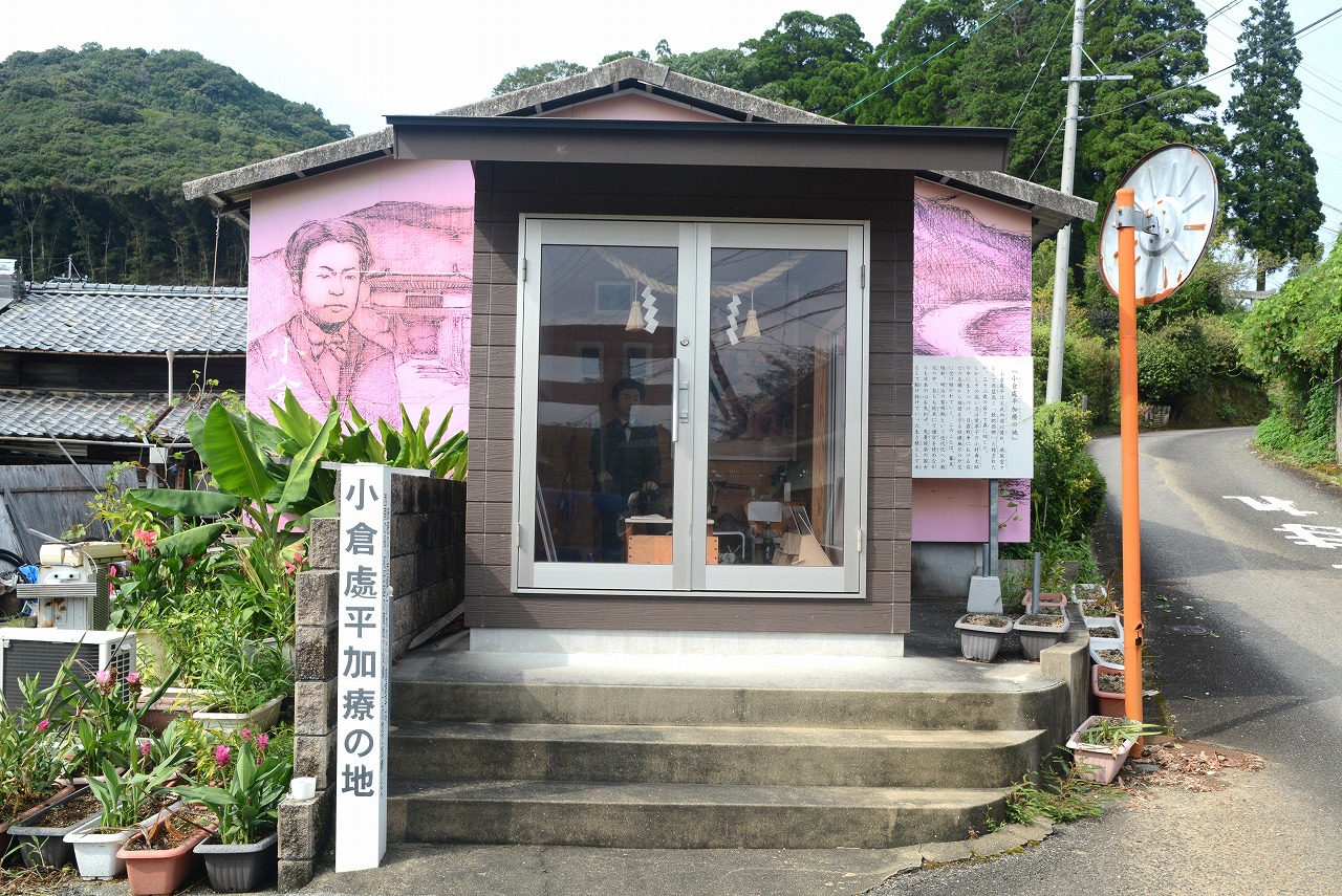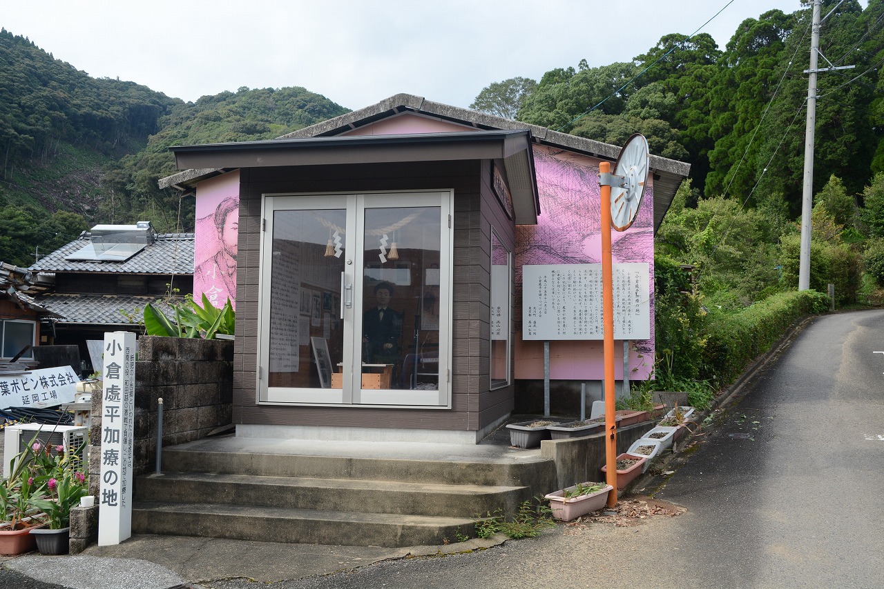 日南市飫肥出身の「小倉處平」(おぐら・しょへい)は、西南の役で薩軍の将として飫肥隊を率いましたが、負傷したことにより、北川町川坂の神田伊助氏宅に逃れて加療しました。小倉は、明治10年(1877年)8月15日の和田越の決戦で、西郷軍奇兵隊5個中隊を率いて熊田に残っていましたが、政府軍の攻撃で隊長の山崎定平が負傷したため、後退してきた熊本隊の救援に向かい、その際、無鹿山で大腿部を負傷しました。西郷軍は和田越の決戦で敗北して長井村へ後退しましたが、小倉は神田氏宅で療養しました。翌日8月16日に西郷隆盛により解軍の令が出されたため、西郷軍のほとんどが政府軍に投降。同8月17日夜に西郷ら投降しなかった西郷軍残存兵は可愛岳の包囲網を突破しました。療養中だったため、可愛岳突囲決定の場にいなかった小倉も、可愛岳突囲の知らせを受けて西郷らの後を追うが合流できず8月18日早朝、可愛岳近くの高畑山中腹で自刃しました。「烏合の衆を以て、天下の大兵に抗するもの半歳。聊か以て武名を辱かしめざるを似たり。然れども事此に至る。亦命なり。宜しく死を以て此志を致すに若かざりなり」と言って自害したと伝えられています。享年32歳。小倉が加療した神田氏宅の角地に、平成25年12月、小倉處平を顕彰する「小倉処平の加療の地を守る記念堂」が完成、小倉の等身大の写真や人形、年譜などが展示されています。