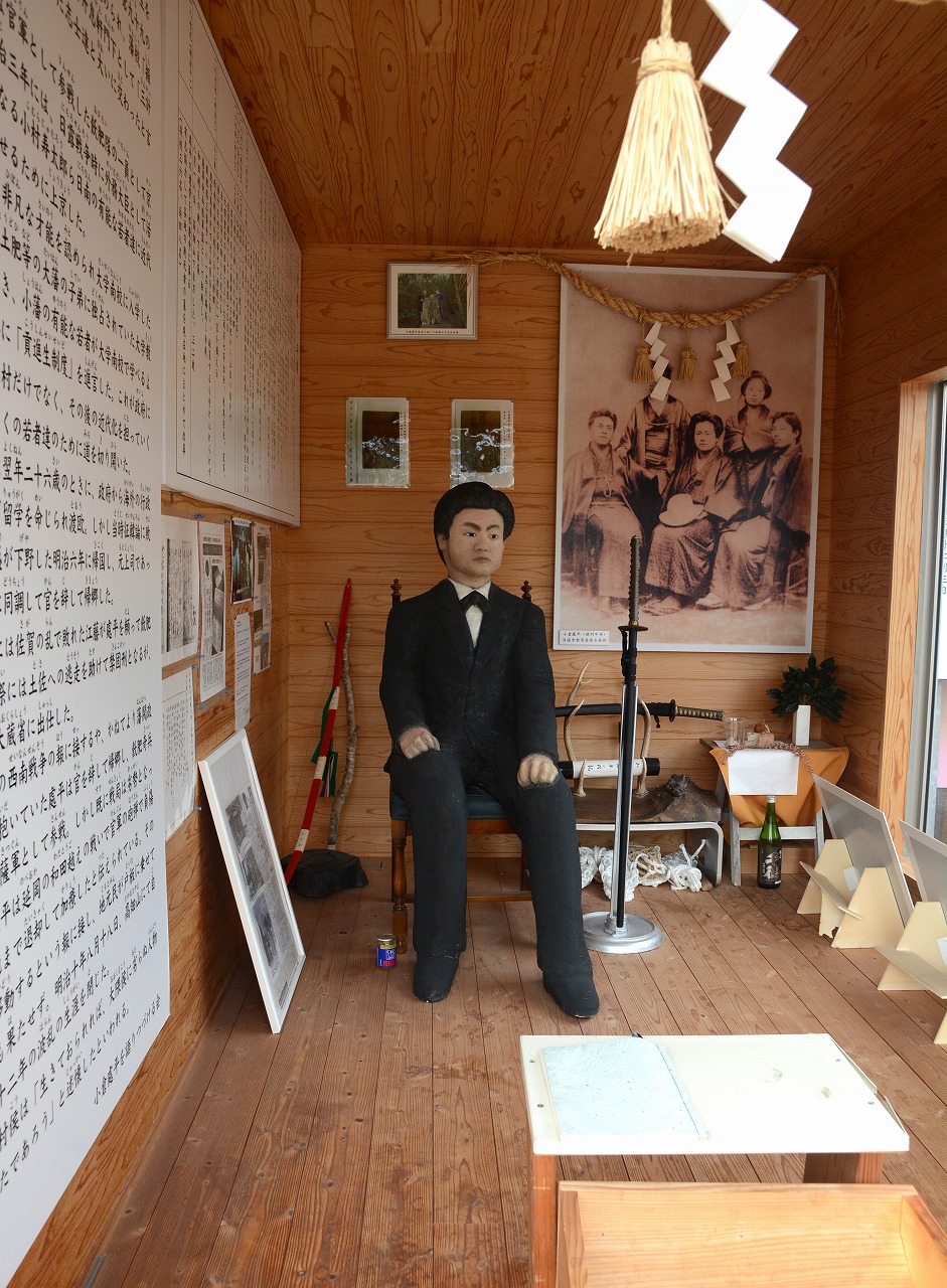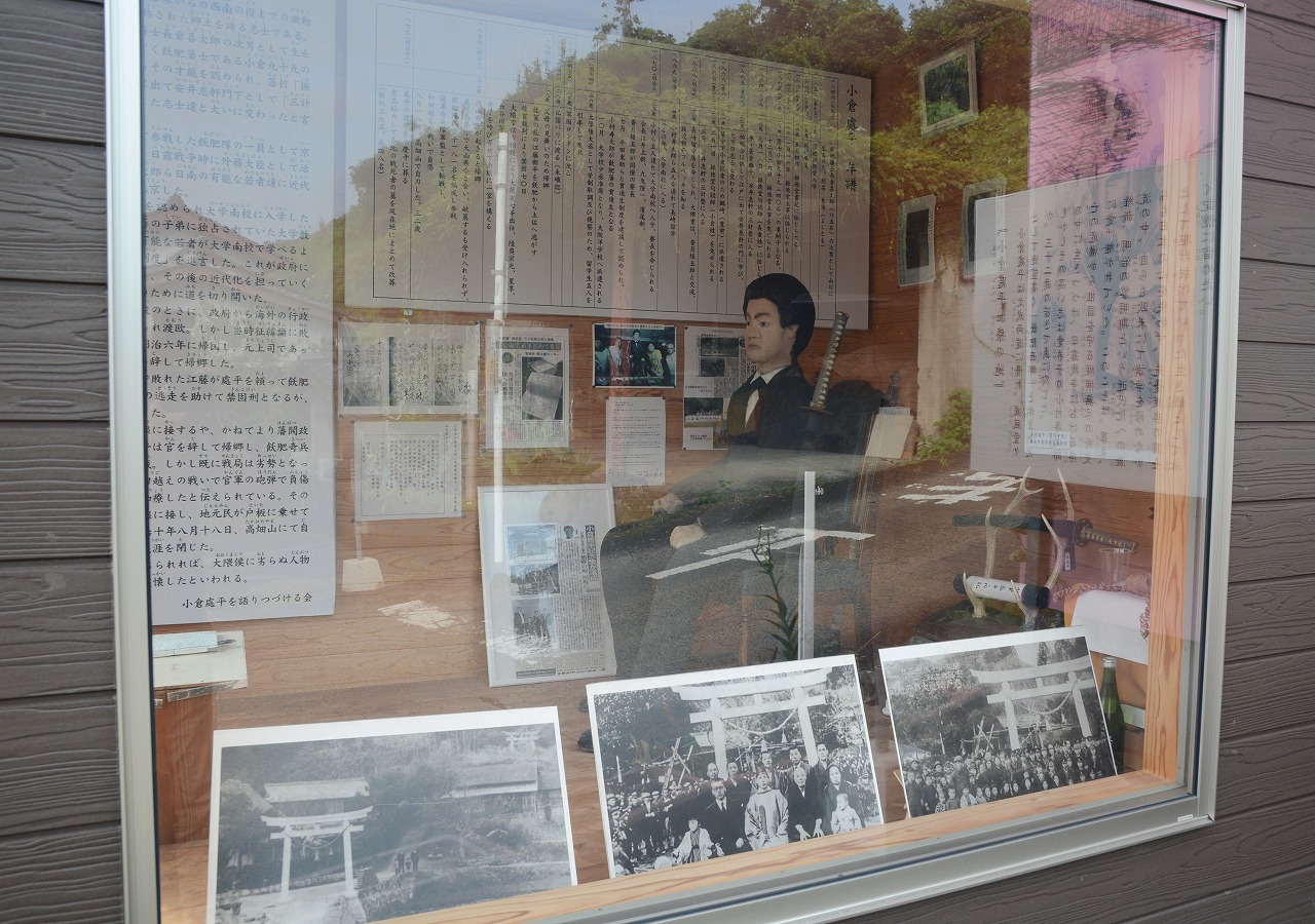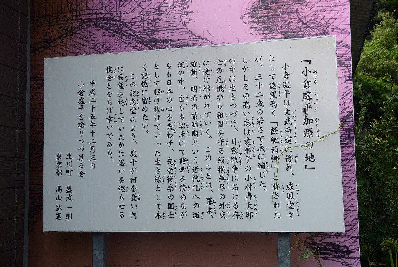 日南市飫肥出身の「小倉處平」(おぐら・しょへい)は、西南の役で薩軍の将として飫肥隊を率いましたが、負傷したことにより、北川町川坂の神田伊助氏宅に逃れて加療しました。小倉は、明治10年(1877年)8月15日の和田越の決戦で、西郷軍奇兵隊5個中隊を率いて熊田に残っていましたが、政府軍の攻撃で隊長の山崎定平が負傷したため、後退してきた熊本隊の救援に向かい、その際に大腿部を負傷しました。西郷軍は和田越の決戦で敗北して長井村へ後退しましたが、小倉は神田氏宅で療養しました。翌日8月16日に西郷隆盛により解軍の令が出されたため、西郷軍のほとんどが政府軍に投降。同8月17日夜に西郷ら投降しなかった西郷軍残存兵は可愛岳の包囲網を突破しました。療養中だったため、可愛岳突囲決定の場にいなかった小倉も、可愛岳突囲の知らせを受けて西郷らの後を追うが合流できず8月18日早朝、可愛岳近くの高畑山中腹で自刃しました。「烏合の衆を以て、天下の大兵に抗するもの半歳。聊か以て武名を辱かしめざるを似たり。然れども事此に至る。亦命なり。宜しく死を以て此志を致すに若かざりなり」と言って自害したと伝えられています。享年32歳。北川町内には小倉處平を顕彰する「小倉処平の加療の地を守る記念堂」が建てられています。