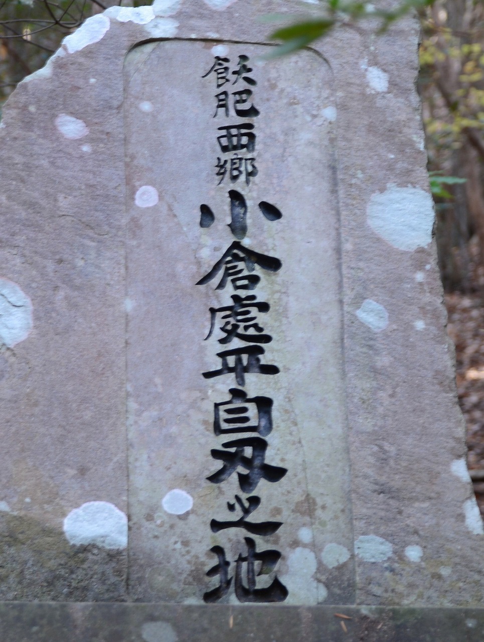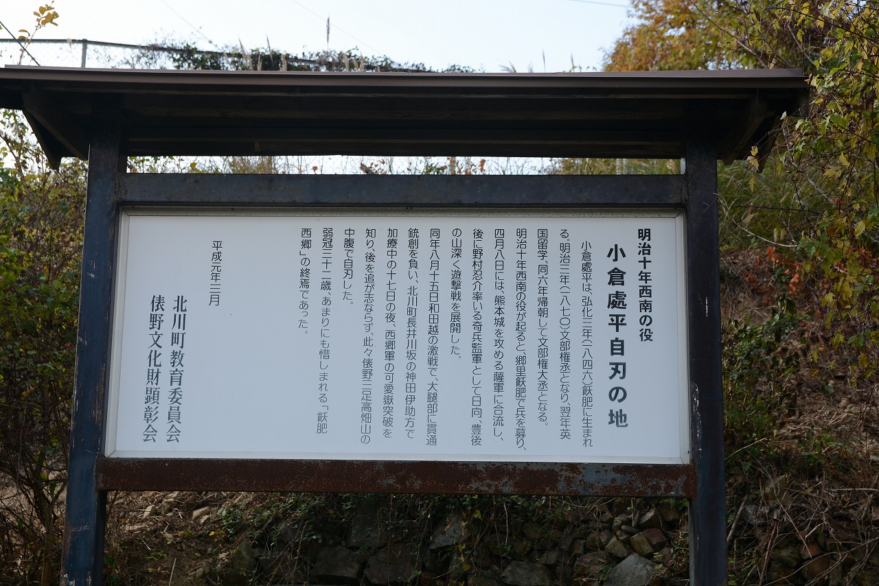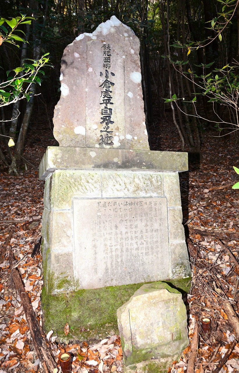 令和7年12月16日早朝、小倉が自刃した同町三足の高畑山を訪ねました。西郷資料館から南に約1キロの三足の集落に入り、農道を西に進みJR日豊本線のガードをくぐってすぐに左折。約300メートル進んだ山際に案内の標柱が立っています。ここから山道を約20分、約450メートル進んだ標高約190メートルの斜面に石碑が建てられています。碑文には『長崎留学制を創立し、小村寿太郎等を送る 明治四年官命により英国に留学、伊藤博文等と親交あり、 明治十年二月飫肥に帰り薩軍に投ず 無鹿山にて大腿に銃創を受け舁(かつ)がれて川坂畑ケ谷神田伊助宅に来たが、永く居らず舁がれてこの地に来り 咽喉を突いて絶命 その後五十五年間この地は 香春健一の踏査迄不明だった 其後四十二年間その碑の建っていないのを嘆いて勲三等黒木政治建立 昭和四十九年十二月』(原文のまま)と書かれています。