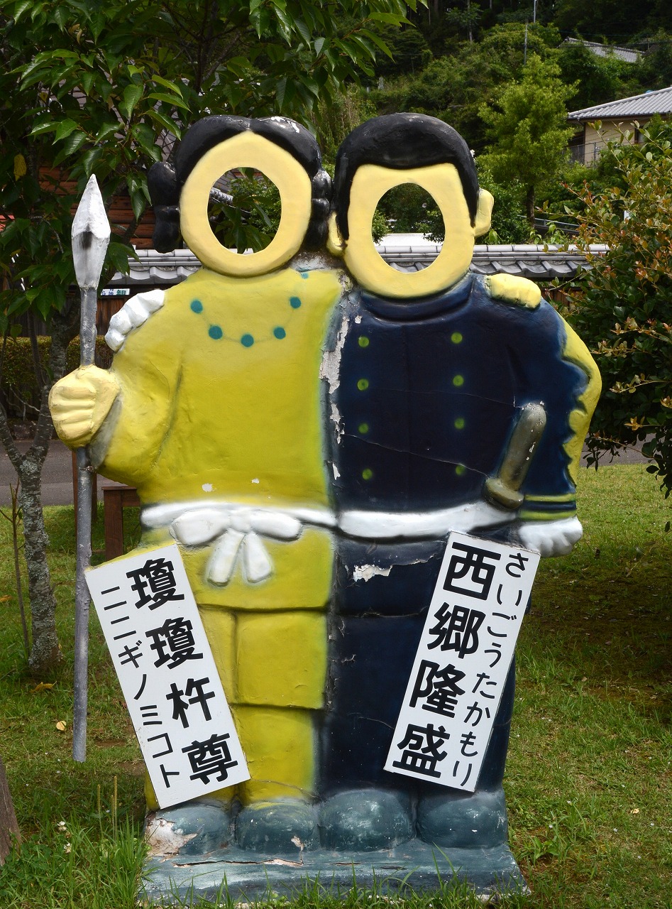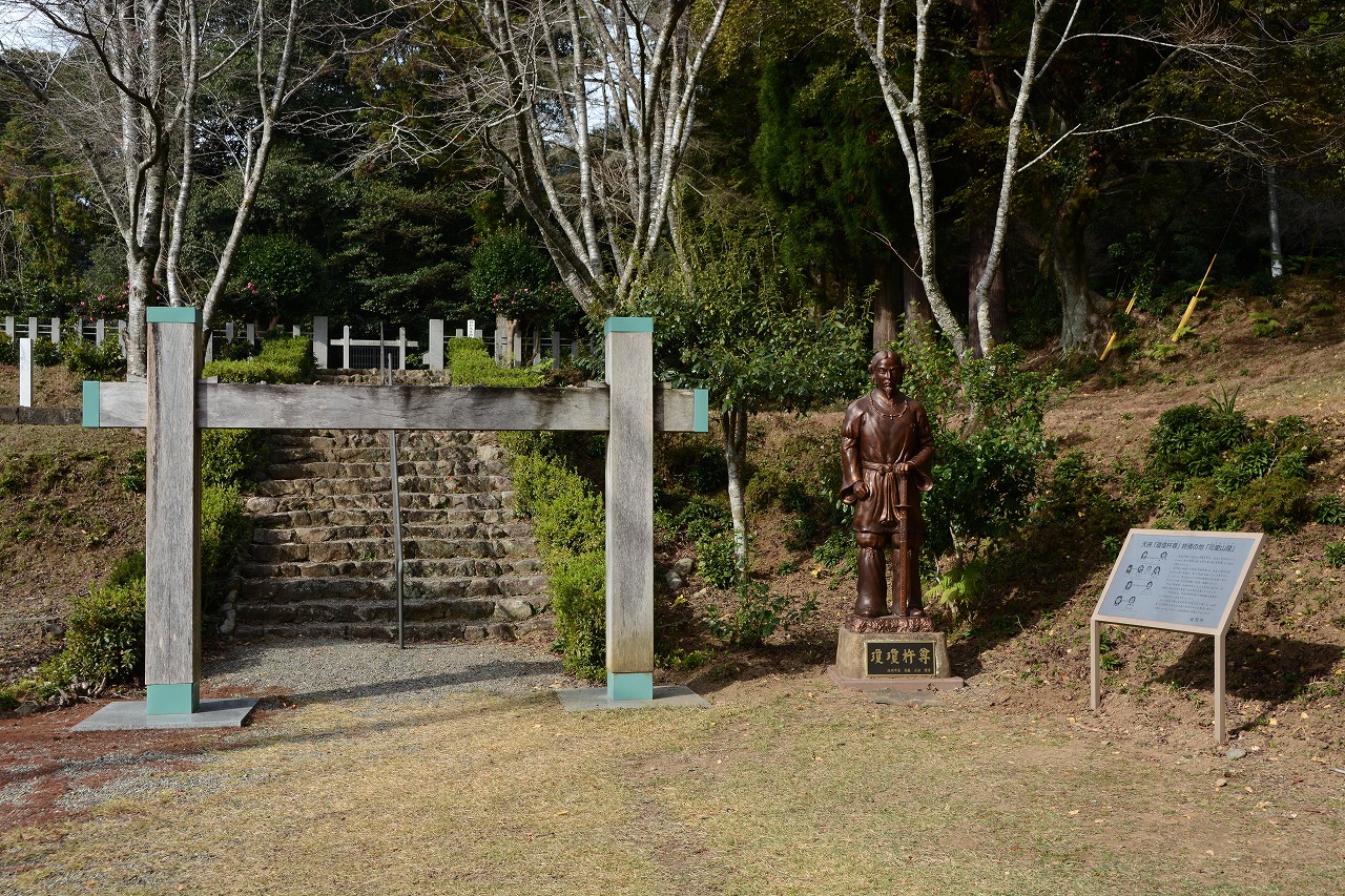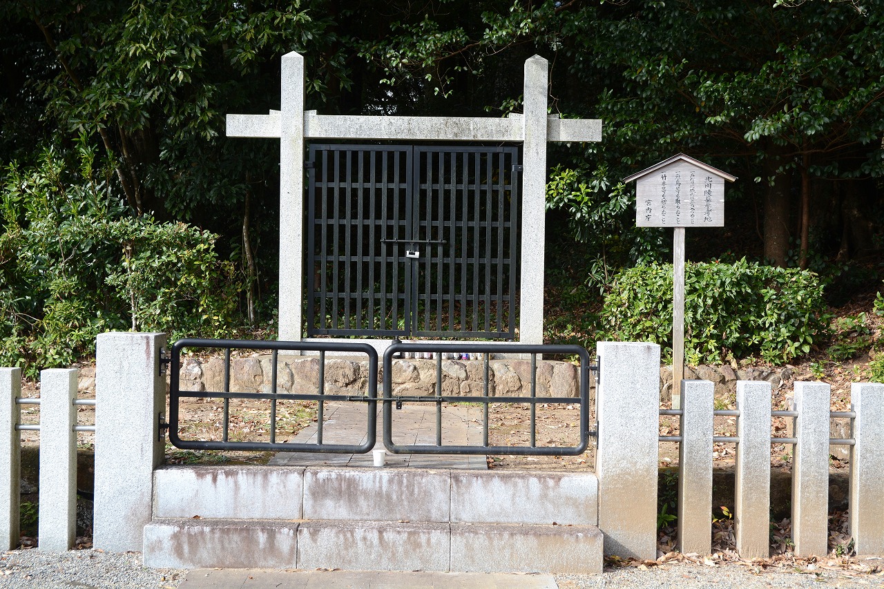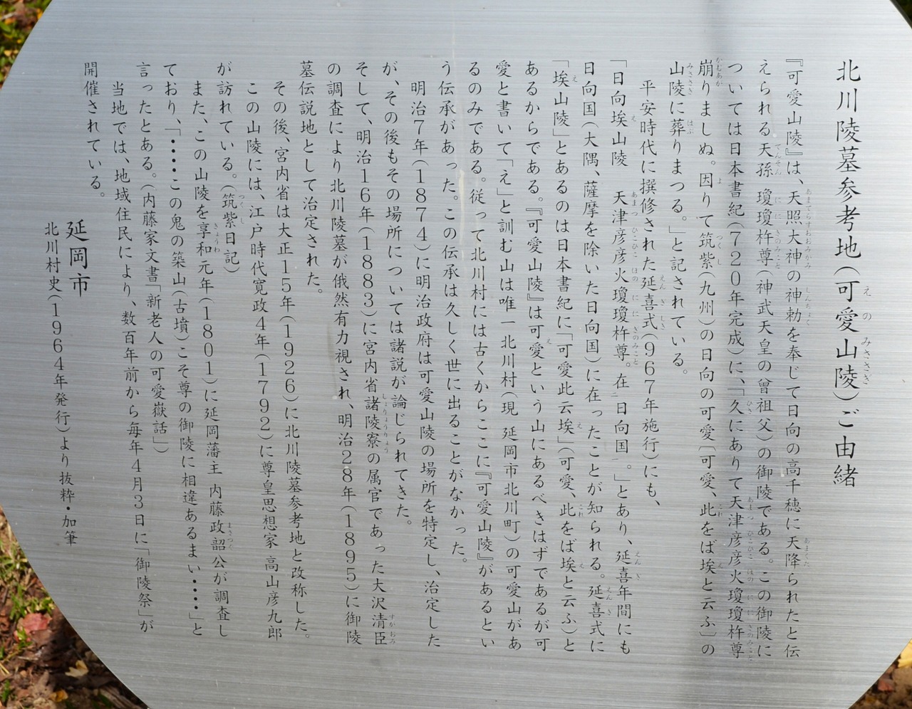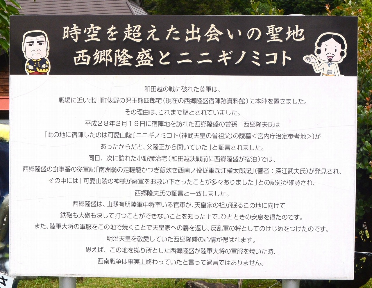 そして、3か所目が、北川町の「可愛山陵(えの・みささぎ)」。ニニギノミコトの終焉地と言われており、可愛岳(えのたけ)の麓にある塚は、明治28年(1895年)に宮内庁から「北川陵墓参考地」として認定されています。陵墓参考地とは、「被葬者は特定できないものの、陵墓である可能性が高いために宮内庁が管理している墳墓など」を指します。北川陵墓参考地は、日本書紀に記されているニニギノミコトの「筑紫日向可愛山之山陵」という記述が、可愛岳を指しているという伝承が根拠となっています。ニニギノミコトは、天照大神(アマテラスオオミカミ)の子孫であり、高天原から高千穂峰へ天降ったとされています。その後、コノハナノサクヤヒメと出会い、結婚し、子どもたちが誕生しました。ニニギノミコトが久しくして崩御した地が、この可愛岳の麓であると伝えられています。明治10年(1877年)の西南戦争の際、西郷隆盛率いる西郷軍がこの可愛岳の麓に宿陣しました。これは「官軍が皇祖の御陵に砲撃しないだろう」という考えがあったためと言われています。西南戦争の際に西郷隆盛の陣屋をこの「可愛山陵」の手前に置いたことで、政府軍は砲弾を飛ばすことはできなかったとされています。