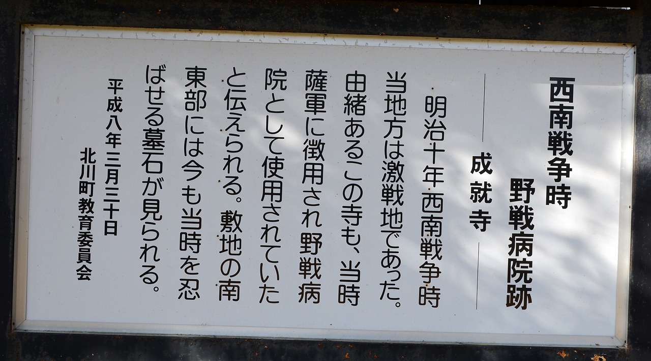 北川町教育委員会が平成8年3月に同寺本堂前に建てた看板には、『西南戦争時 野戦病院跡 成就寺』のタイトルと、「明治十年西南戦争時当地方は激しい戦地であった。由緒あるこの寺も当時薩軍に徴用され野戦病院として使用されていたと伝えられる。敷地の南東部には今も当時を偲ばせる墓石が見られる」の説明書きが添えられています。同寺の山門をくぐると、本堂に向かって左(東)側の小高い敷地に無数の墓石が並んでいます。北川町史などによると、西南戦争が拡大し戦火が延岡に迫った明治10年8月13日、同寺は「薩軍の野戦病院」として使われました。鹿児島県の大口で行われた戦闘で重傷を負った熊本隊の佐々友房(さっさ・ともふさ)もこの寺に入院し、8月17日明け方、白旗を掲げて官軍に捕えられ、監獄に収容され10年の刑に服したと伝えられています。佐々は、獄中で青年子弟を教育し、明治12年(1879)1月に出獄すると、熊本市内で同心学舎を設立(同14年2月に同心学校と改名)、15年2月に濟々黌(現在の熊本県立済々黌高校)と改称しました。
