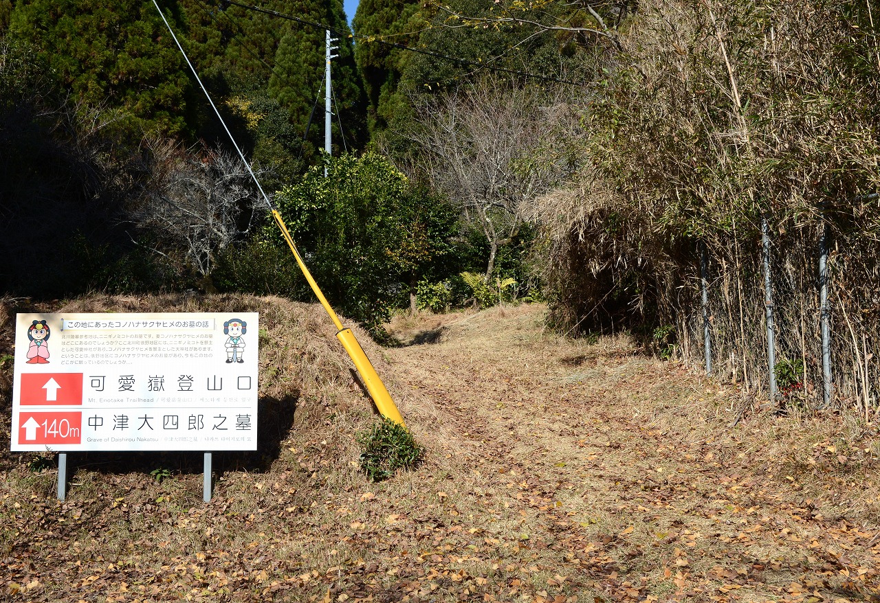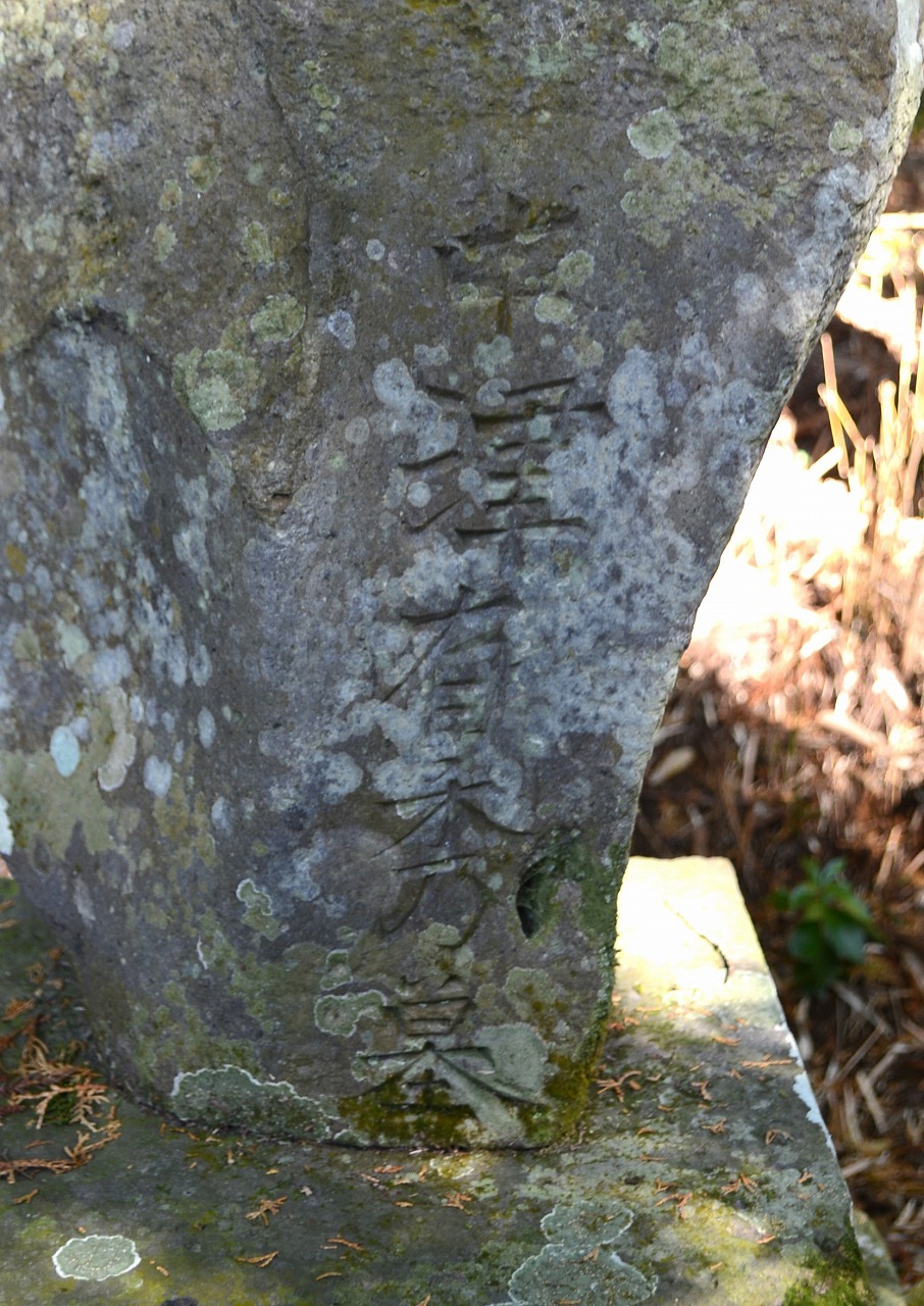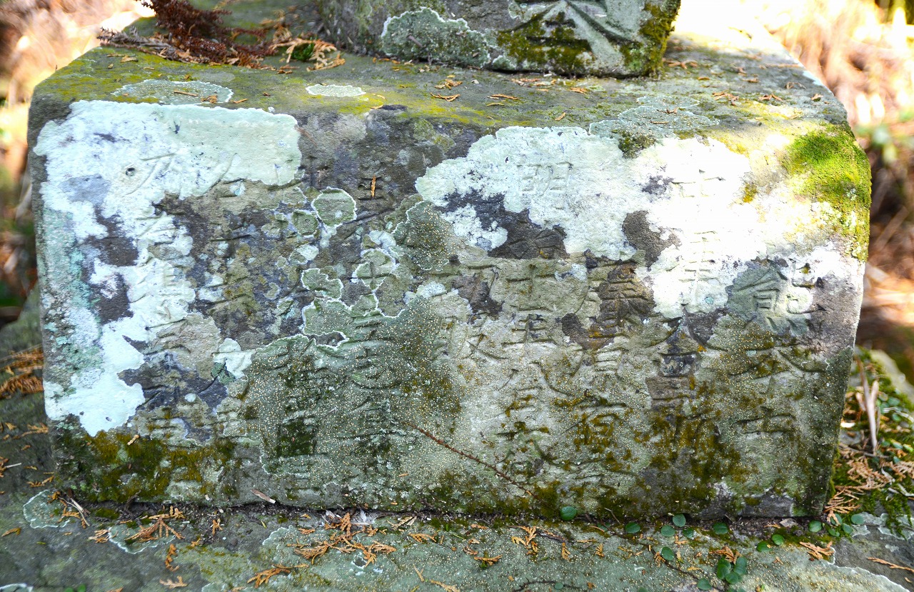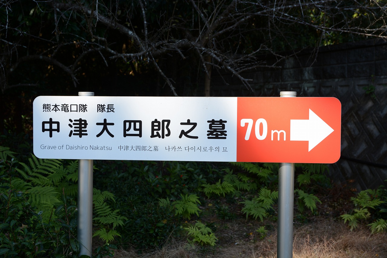 中津大四郎(有秀)は、弘化(こうか)元年(1844)熊本城下生まれ。旧肥後藩士の馬術師範役だった中津は、西南戦争が始まった明治10年(1877)2月20日、同志40人を糾合し(後に200余人となる)久本寺に本営を置いて竜口隊(りゅうこうたい)を結成。薩軍の糧食を供給する炊飯所を設けて軍を後方から支援し、軍が熊本を撤退した後も竜口隊は各地を転戦しました。8月15日の「和田越の戦い」に敗れた後、俵野に追い詰められた薩軍は翌16日に全軍に解散令を出し、ここで諸隊は解散し官軍に降服しましたが、中津は同志達に別れを告げ、さらに西郷、桐野、村田ら薩軍幹部達と面会。「そこもとすでに決するところあり、これより屠腹永訣せん」と言い残し、敗戦の責任を取って竜口隊の副隊長格だった野口勝三を介錯人として、天神社の裏手で自刃しました。34歳でした。部下たちも共に自決することを願い出ましたが、すべて禁止したと伝えられています。中津大四郎の墓は、可愛御陵(えのみささぎ)参考地から北に約140メートル緩やかな坂を上った天神社境内の西側山中にあり、『義乎立志 身波此山爾捨天名乎 末野世爾萬天 乃古須宇禮志佐』(義を立てし 身はこの山に捨ておくも 名を末の世にまでのこす嬉しさ)の辞世の句が刻まれています。自刃の際に大四郎は、天神社の神主に金銭を渡し、自身の墓を建て辞世の句を刻むよう頼んだ、と伝えられています。