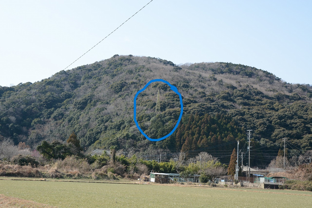 ↓↓ 国道10号から西に高畑山を望む。中央〇印の鉄塔付近が小倉自刃の地