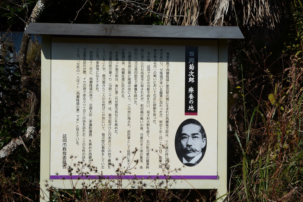 西郷隆盛は33歳の時、幕府改革に失敗した京都の僧侶・月照(げっしょう)と共に追われる身となり、2人で錦江湾(鹿児島)に身を投げましたが、西郷は助かり、その後薩摩藩主に匿われ、奄美大島で生活しました。その時、22歳の島の女性、愛加奈那(あいがな)と結婚し、菊次郎と菊子の2人の子供に恵まれました。菊次郎は8歳で鹿児島の西郷家に引き取られ、12歳で米国に留学しましたが、菊次郎が17歳のときに西南戦争が起こり、帰国して父に従い西南戦争に従軍しました。戦争が始まって間もない明治10年2月27日、菊次郎は、「高瀬の戦い」(現在の熊本県玉名市高瀬)で右足を鉄砲で撃たれ、負傷して歩けなくなりました。菊次郎は6月末に延岡に運ばれ、北町の北藤屋(後藤家)という商家で療養しました。北藤屋は南町の豪商・藤屋の分家にあたります。(藤屋は、同市北小路の「藤仲興産」の前身)。その後市内で右足のひざ下を切断する手術を受け、祝子村大野で療養。「8月11日に薩軍の看護兵と昼食を食べた」という記録が残されています。その後、政府軍が近づいたため、薩軍の野戦病院だった北川町可愛の「成就(じょうじゅう)寺」に運ばれ、療養していましたが、和田越の戦いの後、隣村の俵野の児玉惣四郎宅に運ばれ加療を続けました。8月16日に薩軍が解散し、翌17日夜、俵野から脱出することになりましたが、最後の軍議で可愛岳突囲を決した西郷は、俵野に傷病者を残していくことを決意します。菊次郎もその一人でした。俵野脱出を前に西郷は菊次郎に永遠の別れを告げ、「政府軍の中将として延岡に来ている弟の西郷従道(つぐみち)に会い投降するよう諭した」と伝えられています。西郷は、従者の永田熊吉に「菊次郎はとても連れては行けまい。明日官軍が来たら投降してくれ。延岡には弟も来ているはずだから、何とか引き取って世話をしてくれるだろう。お前が菊次郎を負うて官軍に降参してくれ」と伝えました。西郷らが可愛岳突囲に出たあと、熊吉は菊次郎を背負って従道のところに連れて行きました。従道は、政府陸軍の中将(有栖川征討宮付陸軍中将)で、戦いを視察するため延岡に来ており、従兄の大山巌少将と共に、新小路の小森竹男さん宅に宿泊していました。長い間西郷家に仕えていた熊吉が菊次郎を背負って投降すると、従道は涙を流して喜び、菊次郎を官軍病院に収容し療養させたと伝えられています。従道と菊次郎が会うのはこの時が初めてだったそうです。菊次郎は加療後、暫くして鹿児島に帰りましたが、その際、博愛社(後の赤十字)のお世話になり、帰路に就いたそうです。西南戦争を記した「西南記伝」には、「西郷が俵野を出て可愛岳に向かった後、菊次郎さんは熊吉さんに背負われて、父・西郷さんの後を追いますが、追いつけなかったー」と記されています。また、香春健一著の「大西郷遺聞」には、「菊次郎は西郷が去ったあとも、そのまま惣四郎宅で療養していた」と書かれてます。熊四郎さんの妹で、当時23歳だったイセさん(後に惣四郎さんの妻)の話では、「鹿児島から2人の女性が俵野に来て、菊次郎の看病をしていた」ようです。一人は高貴な感じの女性、一人はお手伝いさんらしく、高貴な女性はもっぱら幼児の世話、菊次郎の看病はお手伝いの女性だったそうです。西郷の孫で後に参議院議員として法務大臣を務めた西郷吉之助が俵野を訪れた際、「一人は『イト』です。」と話したそうです。イトは西郷の正妻で、イトが連れてきた幼児は西郷の子で、当時3歳の酉三(とりぞう)だと思われます。