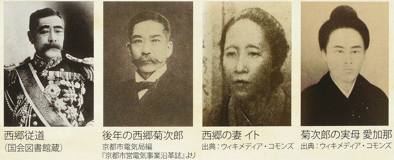 西郷菊次郎~西南戦争後、23歳で外務省に入り、アメリカ公使館や本省で勤務。1887年(明治20年)6月に再びアメリカへ留学。新渡戸稲造から情報を得て、彼と同じジョンズ・ホプキンス大学政治学科に在籍した。右足の宿痾により留学を中断し、帰国の後、1890(明治23年)1月、宮内省式部官。日清戦争で日本が台湾を得た1895年(明治28年)、台湾に転じ、基隆支庁長、宜蘭長官(4年半)に就任。日本に帰国後、京都市長(6年半)などの任にも就く。この期間に「京都百年の大計」として京都市の三大事業「第二琵琶湖疎水(第二疏水)開削」、「上水道整備」、「道路拡築および市電敷設」を推進した。1911年(明治44年)、病気を理由に京都市長を辞職した。辞任後、鹿児島県に帰郷したが、その功績により多額の慰労金が京都市より贈呈されることがきまり、療養中の菊次郎がそれを受け取った。1年の療養ののち1912年(明治45年)7月、島津家管理の永野金山鉱業長に就任した。在任中は夜学校を開き、自費で武道場を建てるなど、青少年人材育成と地域づくりに多大な貢献をし、在任8年目の1920年(大正9年)に辞職。1928年(昭和3年)11月27日、鹿児島市薬師町の自宅で心臓麻痺により死去した。満67歳没。