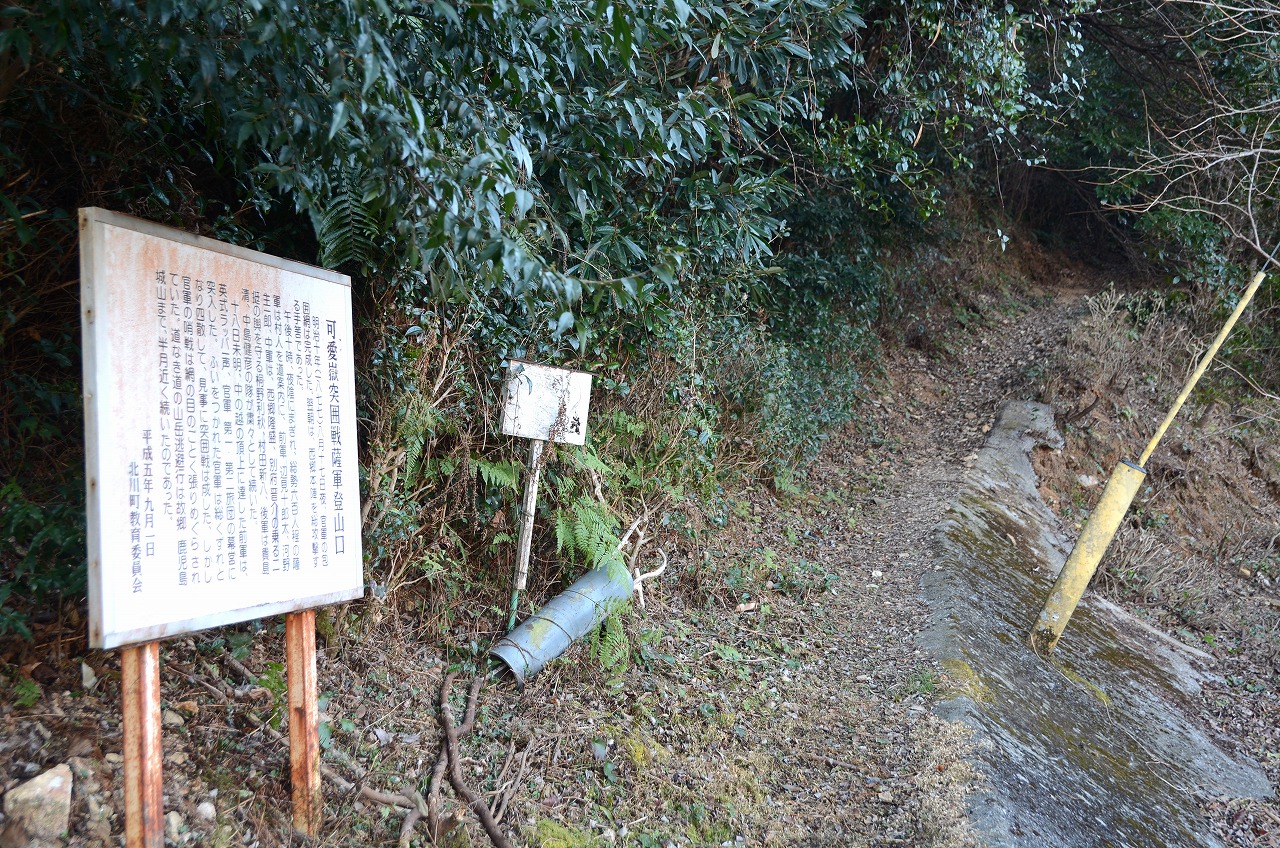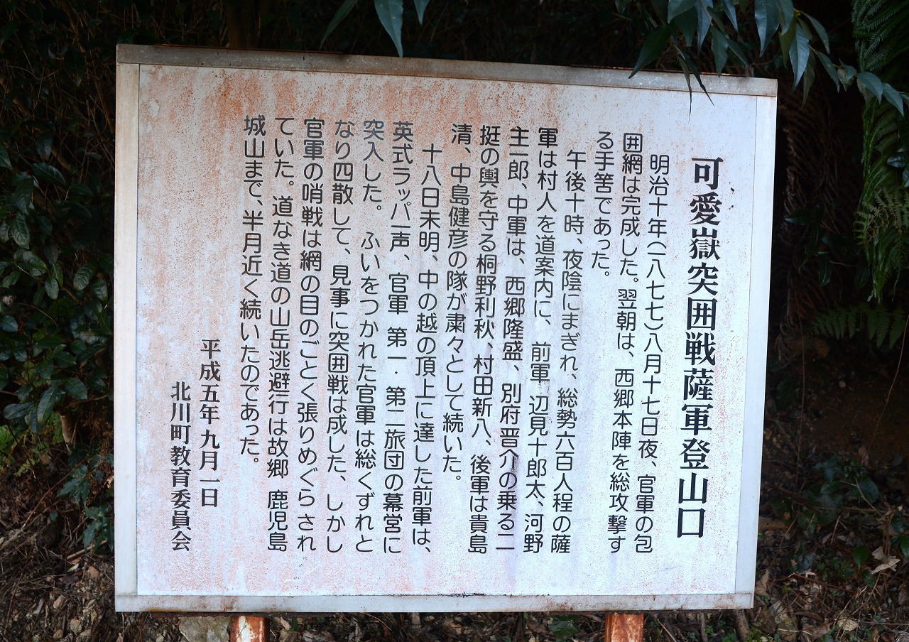 可愛嶽突囲戦薩軍登山口→明治10年(1877)8月17日夜、官軍の包囲網が完成し、翌朝、西郷本陣を総攻撃する手筈でしたが、午後10時、夜陰にまぎれ、総勢600人程の薩軍は村人を道案内に、前軍=辺見十郎太、河野圭一郎、中軍=西郷隆盛、別府晋介の乗るニ挺の輿を守る桐野利秋、村田新八、後軍=貴島清、中島健彦の隊が粛々として続きました。18日未明、中の越の頂上に達した前軍は、英式ラッパ一声、官軍 第1・第2旅団の幕営に突入しました。ふいをつかれた官軍は総くずれとなり、四散して、見事に突囲戦は成しました。しかし官軍の哨戦は網の目のごとく張りめぐらされており、道なき道の山岳逃避行は故郷 鹿児島城山まで、半月近く続きました