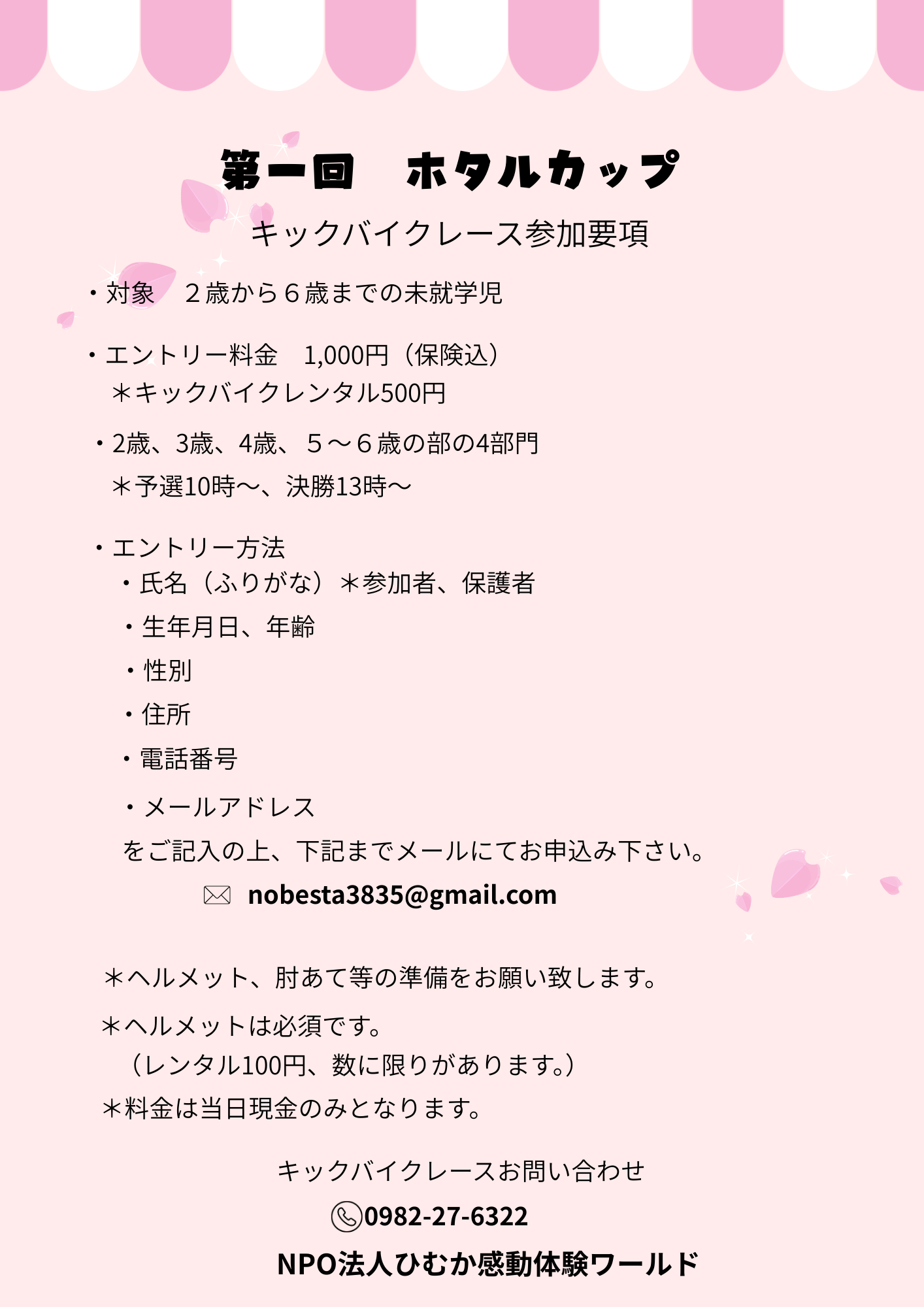 〇対象=2歳~6歳の未就学児で、エントリー料金は一人1000円(保険料込み)。キックバイクレンタル料500円。料金の支払いは、当日現金のみです。