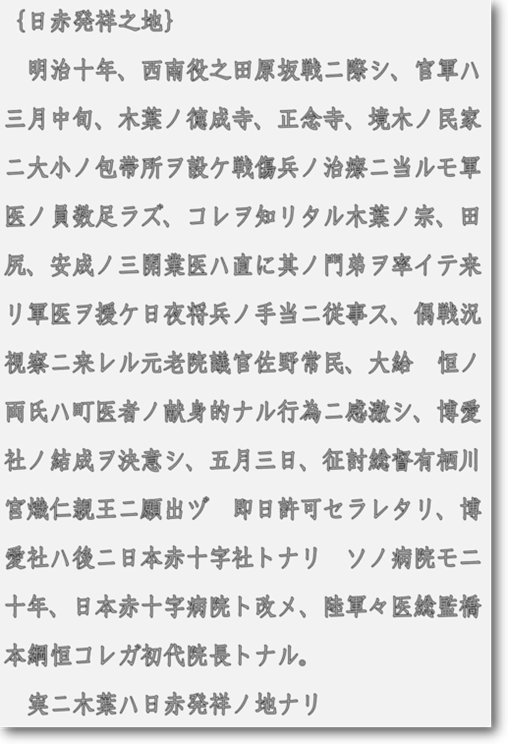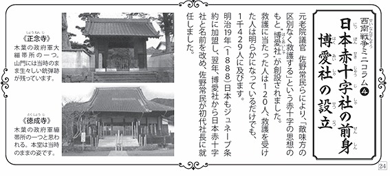西南戦争では、熊本、宮崎、大分、鹿児島が主要な戦場となり、多くの負傷者が出たため、戦場で負傷した兵士の治療を行う「包帯所」は重要な役割を果たしました。熊本県玉名郡玉東町の「徳成寺」は 、西南戦争当時、野戦病院を置き、 敵味方分け隔てなく負傷した人々を救護・療養したところで、「文化庁」によると、現存している唯一の建造物です。このご縁により、玉東町は「日本赤十字発祥の地」といわれています。「西南の役」当時、多数の戦傷者を収容できるのは主に寺院だったそうです。その一つが徳成寺本堂で仮包帯所と呼ばれました。仮包帯所では、弾を抜く、消毒、骨をつぐといった応急的な手当てが行われました。徳成寺の山道右脇に「官軍病院阯」および「日赤発祥之地」と刻まれた石碑が建っています。徳成寺は、旧三池往還より少し奥まった木葉山の麓に位置しています。玉東町には、他にも「官軍墓地」や「戦線の遺跡」など、西南の役にゆかりのある場所が点在しています。