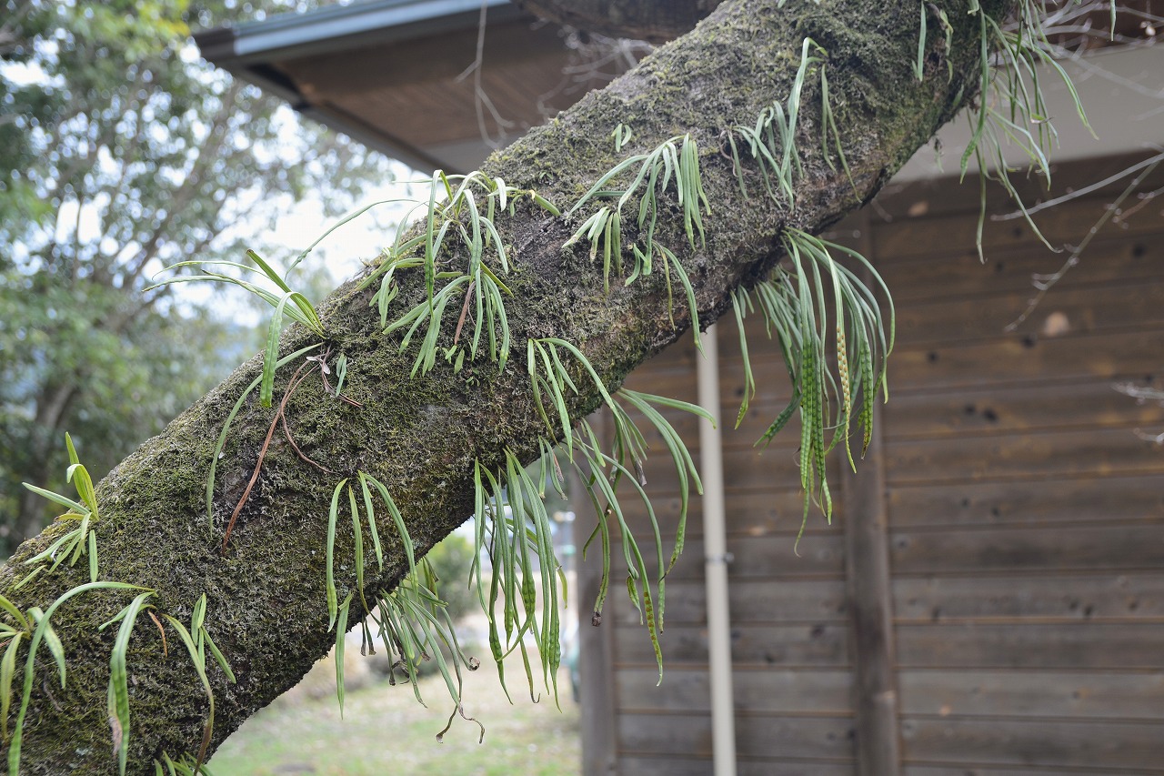 「ノキシノブ」(軒忍)というウラボシ科の多年草で、薬用や園芸用としても知られているそうです。別名、ヤツメラン(八目蘭)と言い、円形の胞子嚢群が目玉のように並ぶことから、この名前が付けられてそうです。ノキシノブは、日本各地に分布する常緑性のシダ植物です。「軒忍」という和名は、家の軒先など水が少ない過酷な環境でも、じっと堪え忍んで生きているという意味で付けられました。乾燥している時は葉をクルンと丸めて水分蒸発を防ぎ、雨が降るとピン!と元気になります。 そして、昼間は気孔を閉じて耐え、夜になると呼吸をするという、とってもエコな生活をしています。