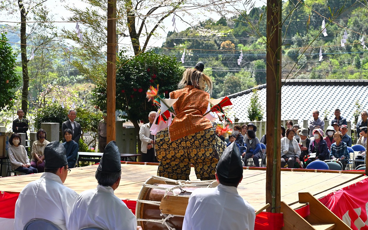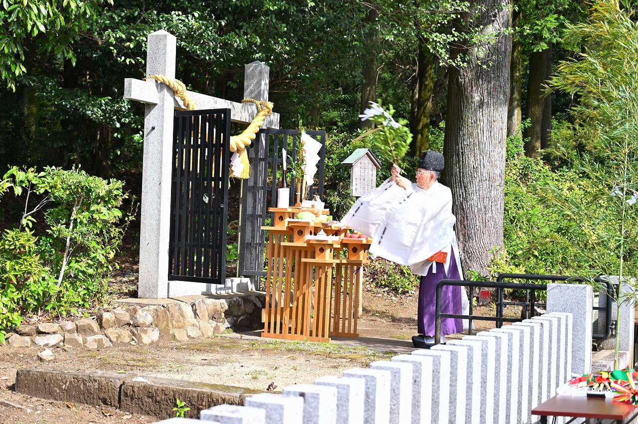 ニニギノミコトの御陵と伝わる俵野の「可愛山陵」(えのみささぎ)で5日、御陵祭が開かれ、地域の人や市職員らが地域の繁栄や健康などを祈りました。主催は俵野文化財顕彰会(児玉正三会長)。天神社の井本盛実宮司が祝詞を奏上、参列者が1人ずつ祭壇に玉串を捧げた後、川坂神楽保存会(廣瀬和男会長)の会員7人が神楽を奉納しました。御陵祭は神武天皇の命日である4月3日に毎年開催していましたが、2年前から命日に近い日曜日に開催されています。